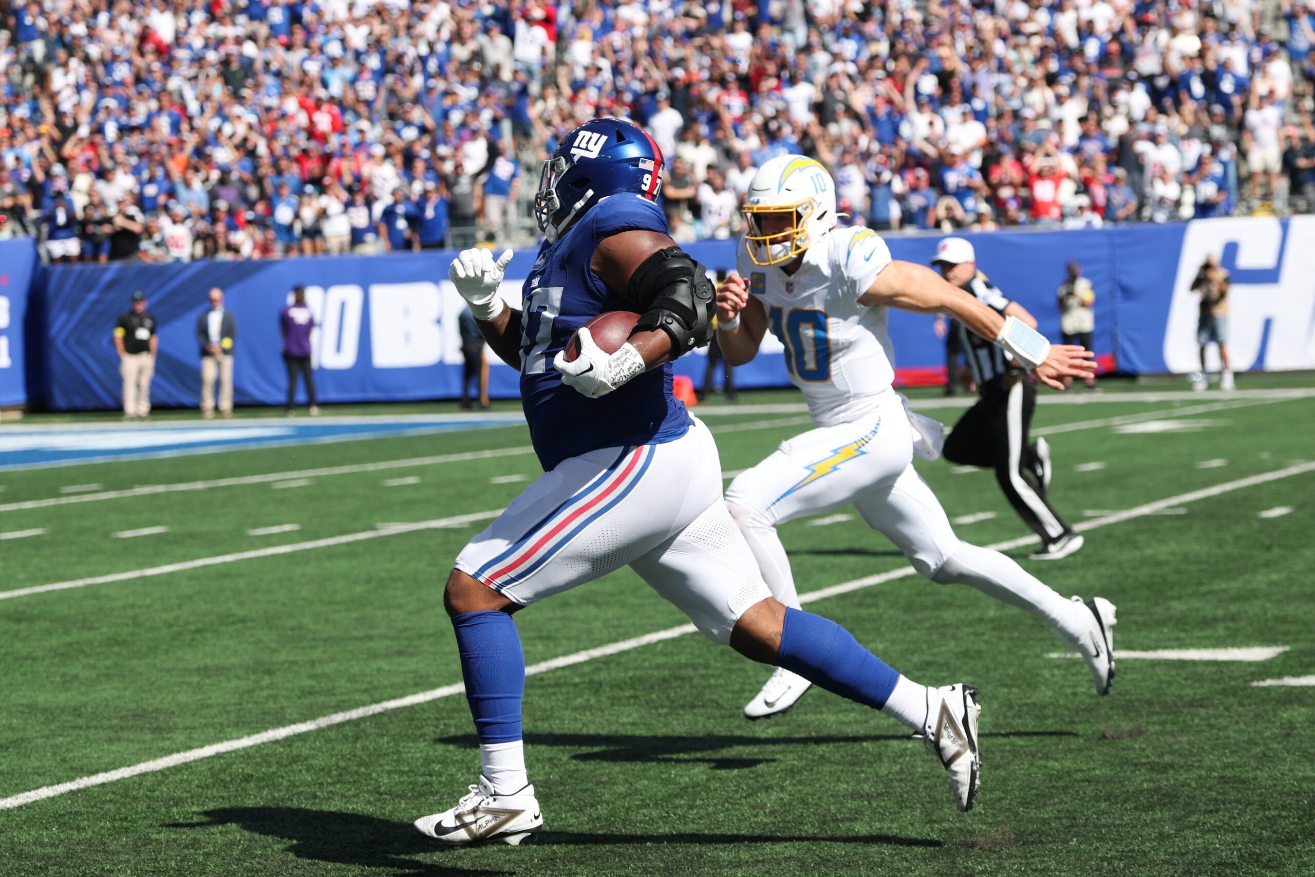 Sep 28, 2025; East Rutherford, New Jersey, USA; New York Giants defensive tackle Dexter Lawrence II (97) returns an interception as Los Angeles Chargers quarterback Justin Herbert (10) defends during the first quarter at MetLife Stadium. Mandatory Credit: Vincent Carchietta-Imagn Images