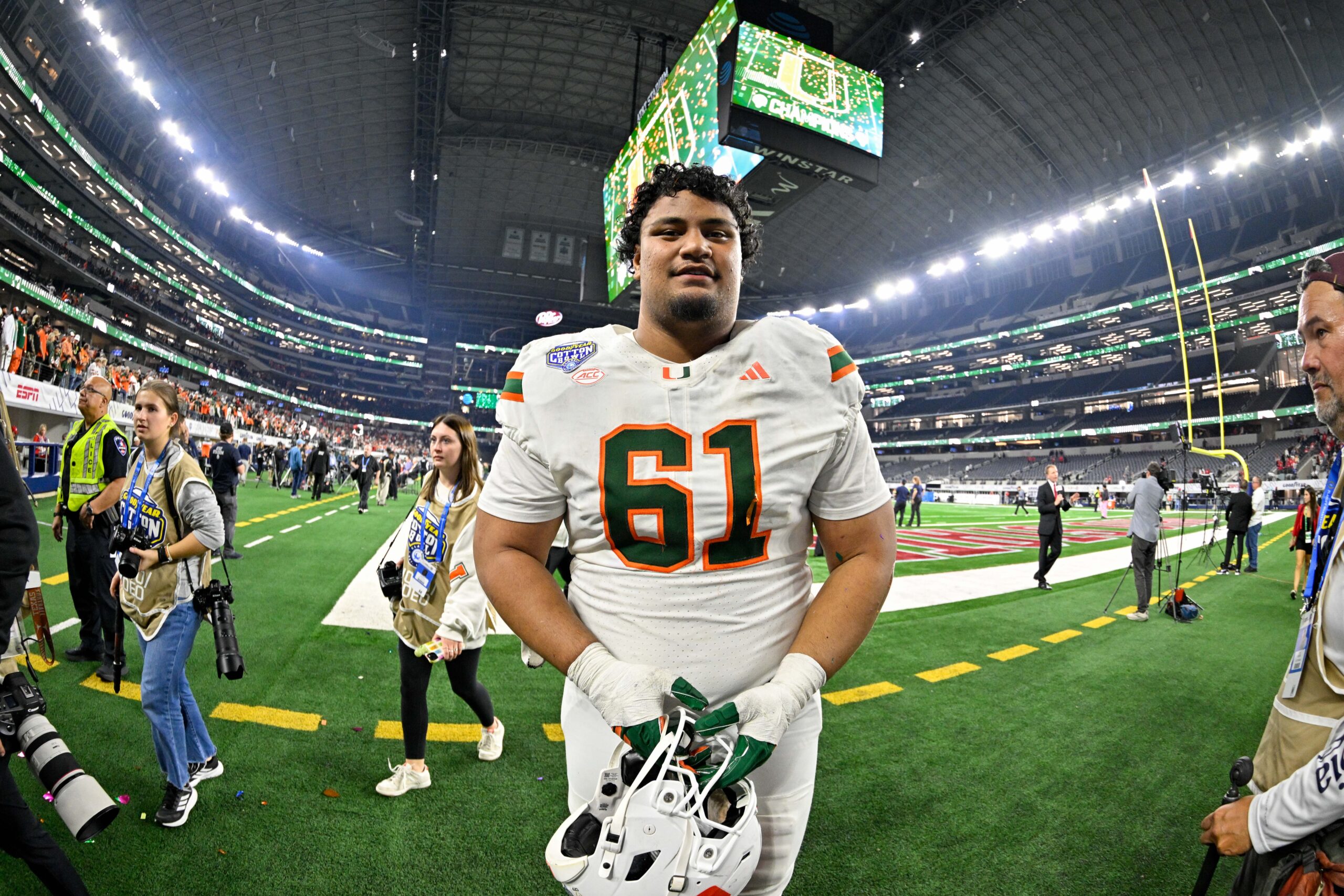 Dec 31, 2025; Arlington, TX, USA; Miami Hurricanes offensive lineman Francis Mauigoa (61) walks off the field after the 2025 Cotton Bowl and quarterfinal game of the College Football Playoff at AT&T Stadium. Mandatory Credit: Jerome Miron-Imagn Images