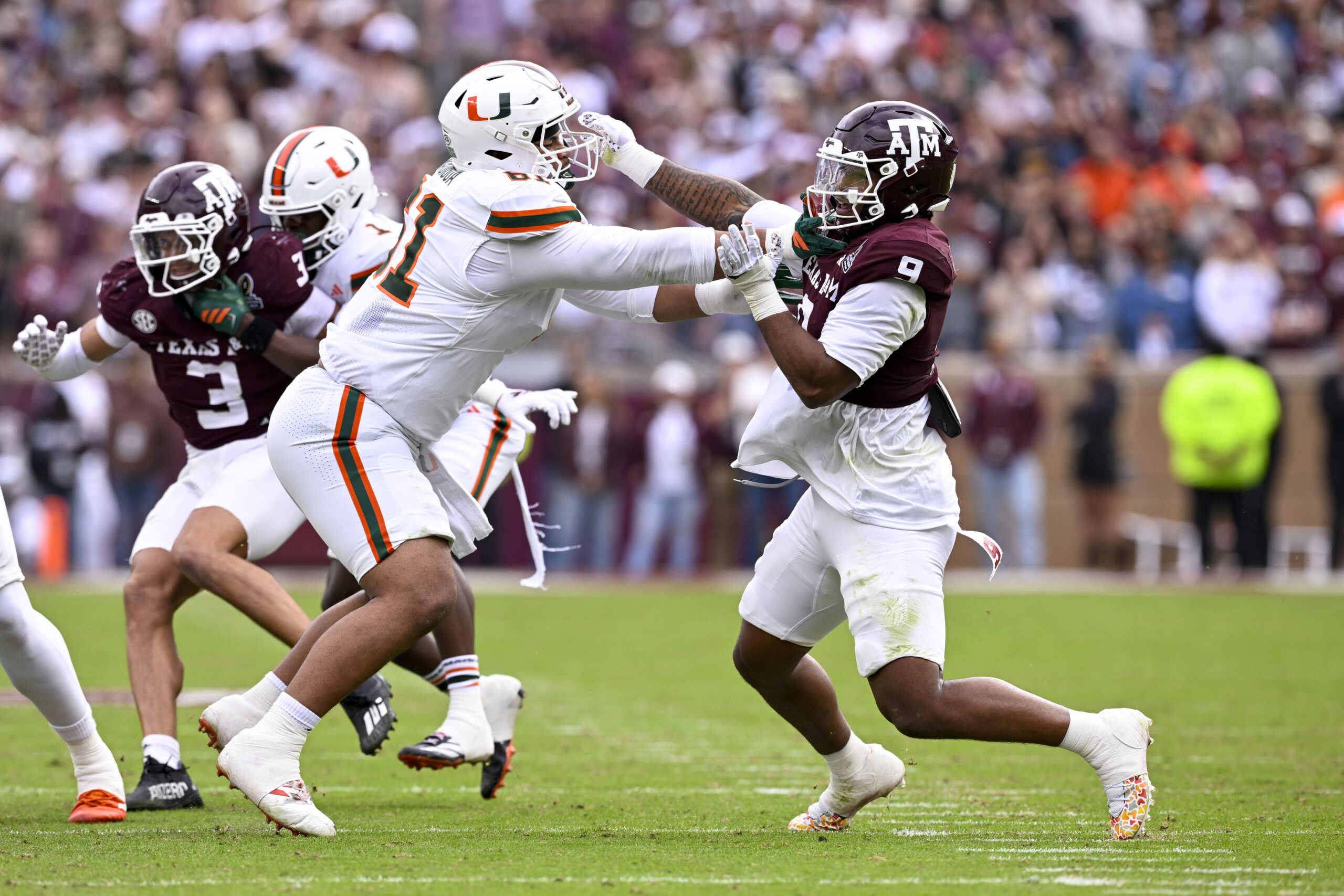 Dec 20, 2025; College Station, TX, USA; Miami Hurricanes offensive lineman Francis Mauigoa (61) blocks Texas A&M Aggies defensive end Cashius Howell (9) during the game between the Aggies and the Hurricanes at Kyle Field. Mandatory Credit: Jerome Miron-Imagn Images