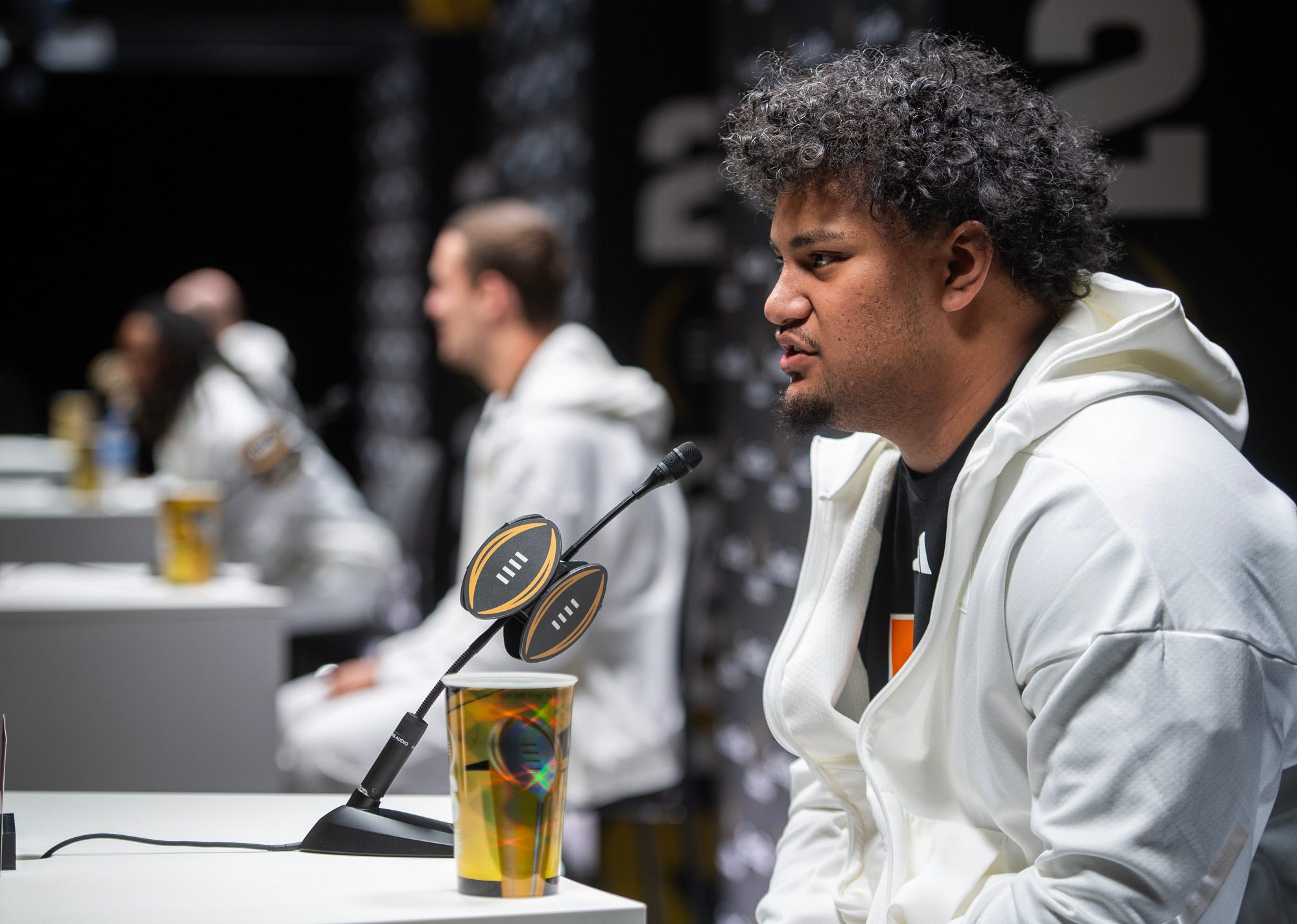 University of Miami’s Francis Mauigoa talks at Media Day during the College Football Playoff on Saturday, Jan. 17, 2026.