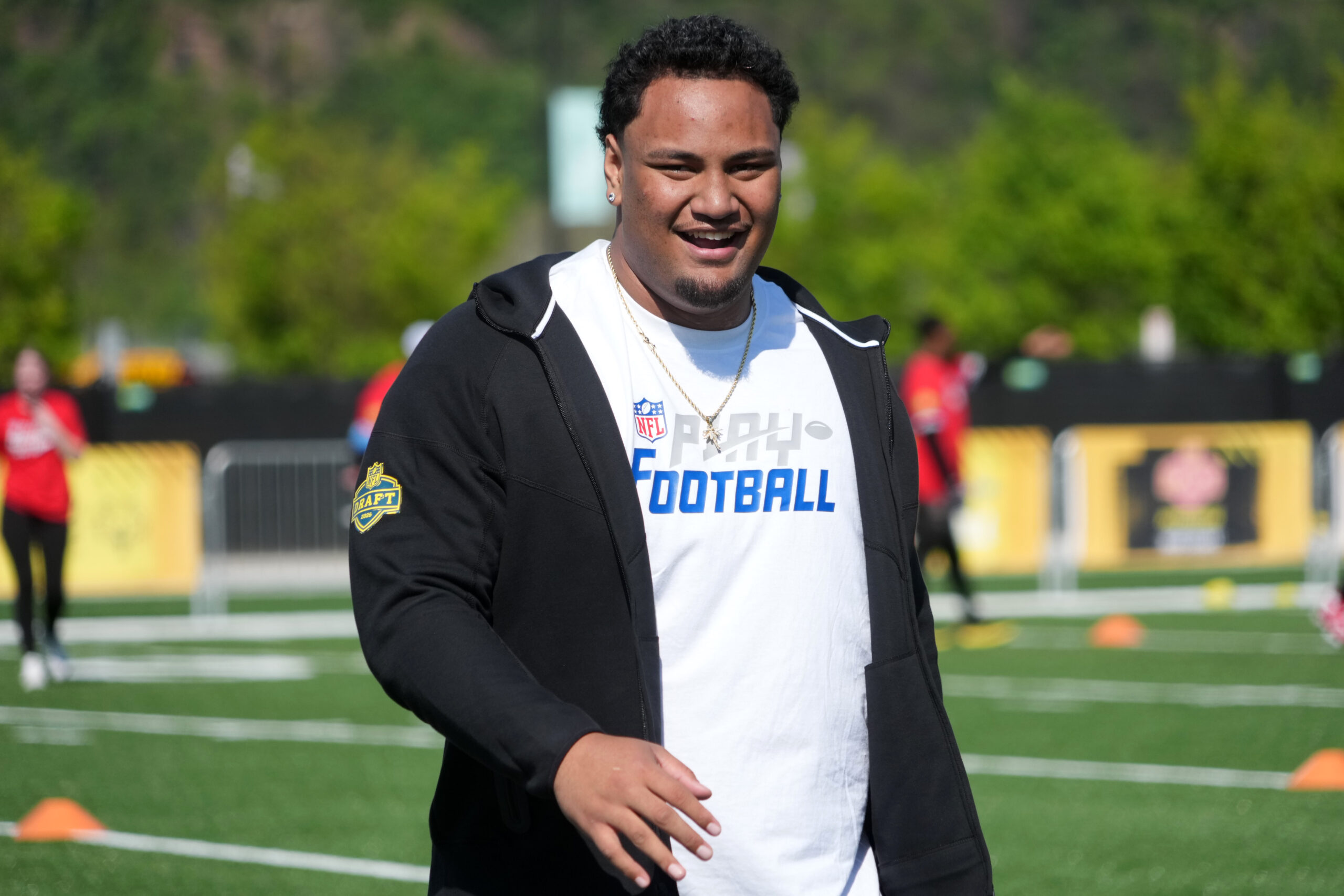 Apr 22, 2026; Pittsburgh, PA, USA; Miami Hurricanes lineman Francis Mauigoa during the NFL Draft prospects clinic at Hazelwood Green Park. Mandatory Credit: Kirby Lee-Imagn Images