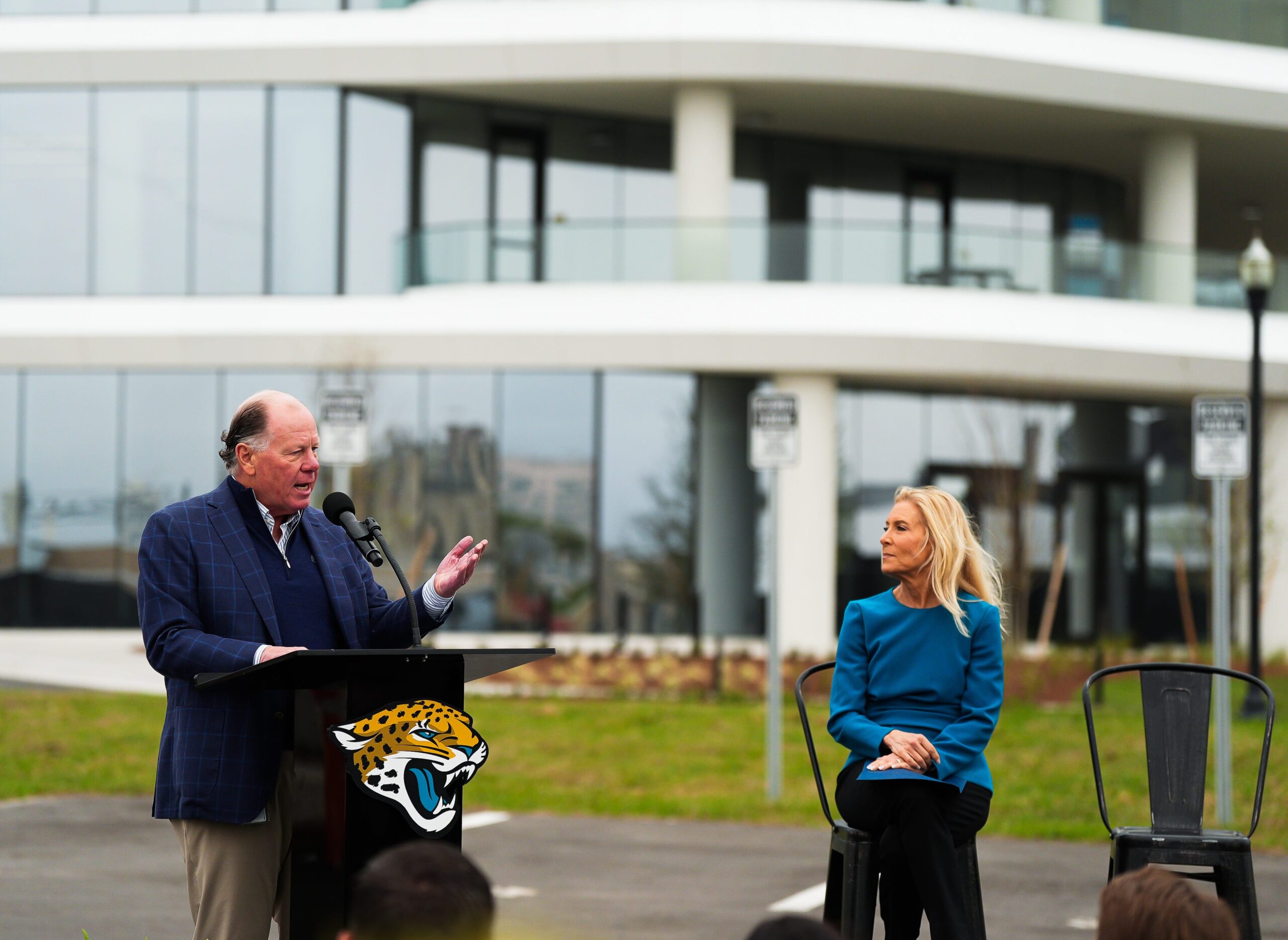 Jaguars president Mark Lamping, left and City of Jacksonville Mayor Donna Deegan took part in the grand opening and ribbon cutting ceremony for the Jacksonville Jaguars’ newly opened business operations office at One Tower Court, Wednesday March 25, 2026. [Doug Engle/Florida Times-Union]