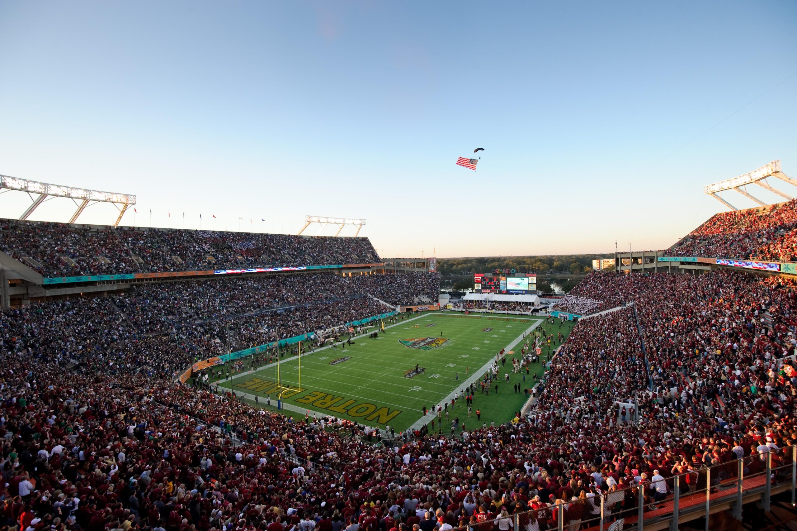 Dec. 29, 2011; Orlando, FL, USA; United States Army Master Sergeant (retired) Andy Serrano parachutes into the Citrus Bowl with the U.S. Flag before the Champs Sports Bowl between the Notre Dame Fighting Irish and the Florida State Seminoles. Mandatory Credit: Matt Cashore-Imagn Images