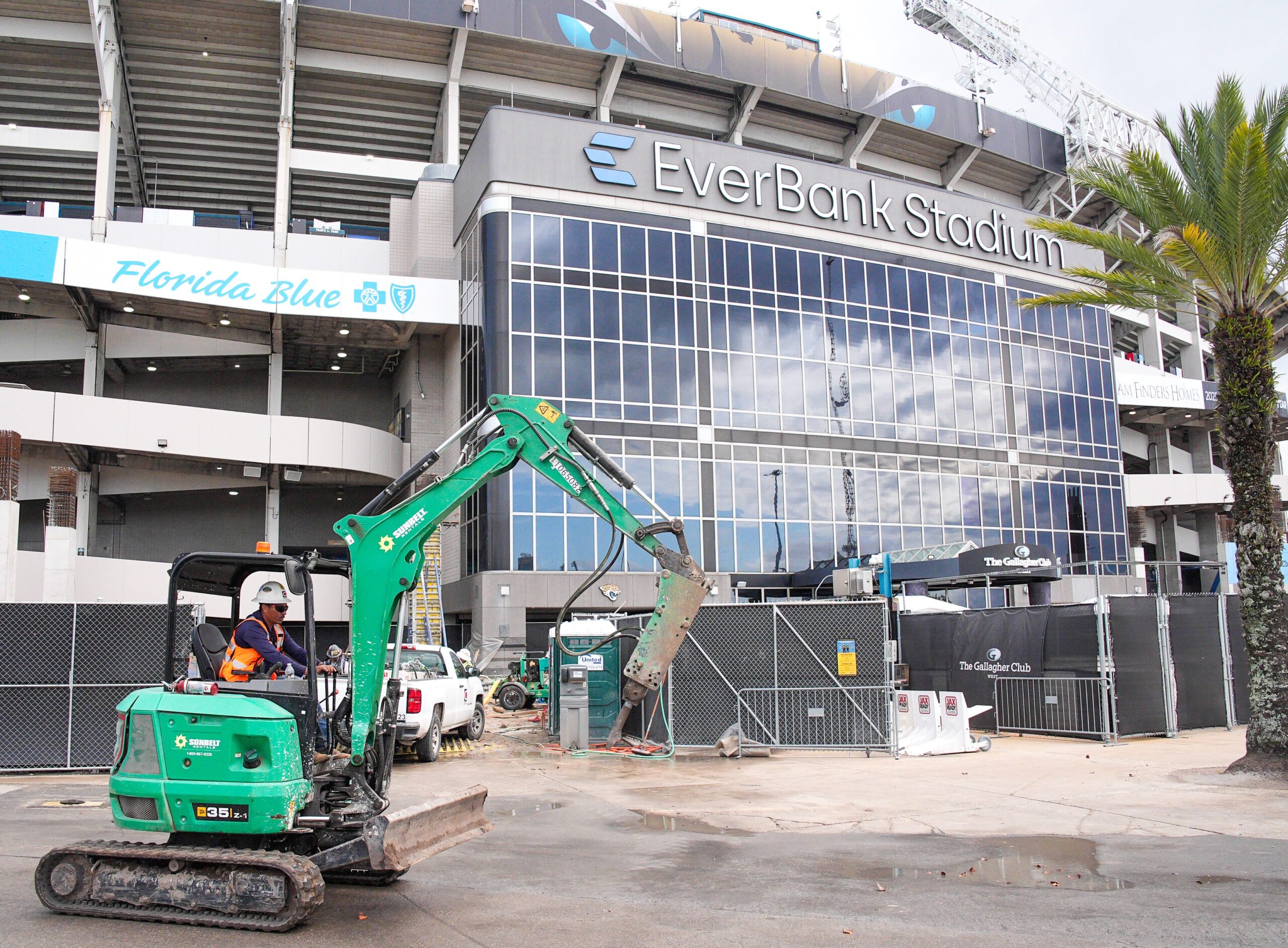 A construction worker drives a miniature excavator with a jack hammer attached during the renovations at EverBank Stadium Tuesday December 2, 2025 in Jacksonville, Fla. The construction is slated to finish in time for the Jaguars to play in the renovated stadium for the 2028 season. [Doug Engle/Florida Times-Union]