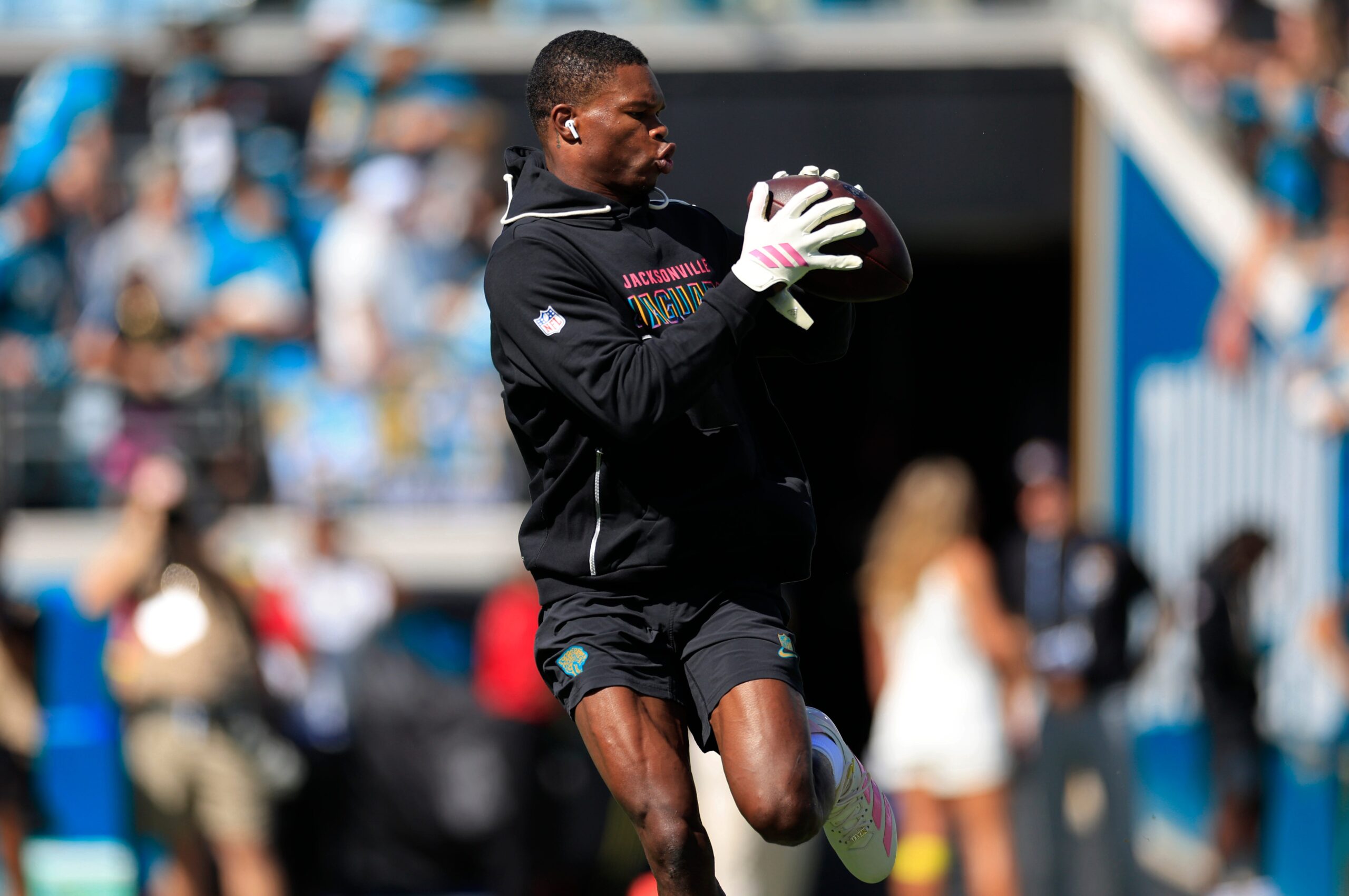 Jacksonville Jaguars wide receiver Travis Hunter (12) catches a pass before an NFL football matchup, Sunday, Oct. 12, 2025, at EverBank Stadium in Jacksonville, Fla. [Corey Perrine/Florida Times-Union]