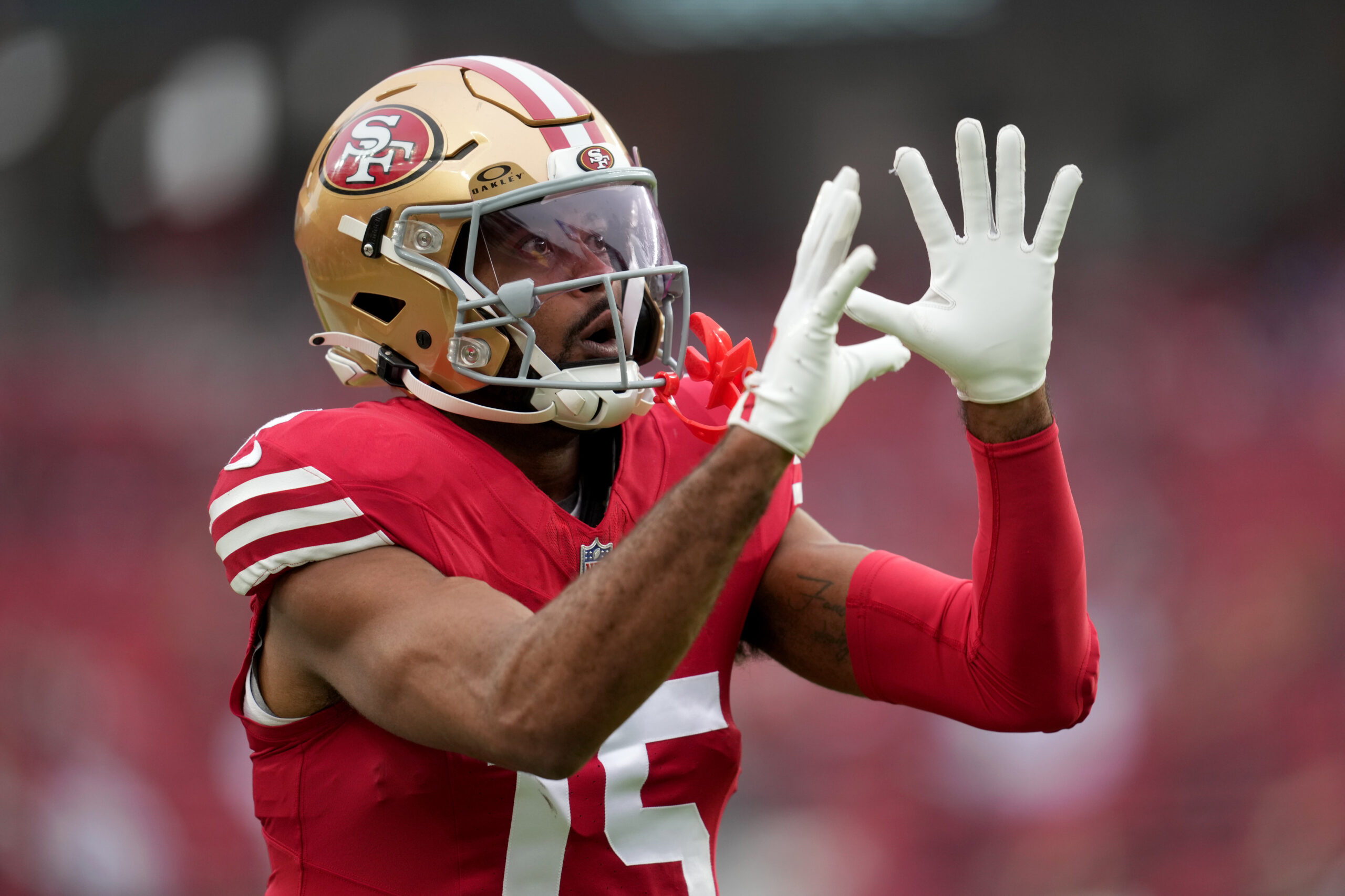 Dec 14, 2025; Santa Clara, California, USA; San Francisco 49ers wide receiver Jauan Jennings (15) warms up prior to the first half against the Tennessee Titans at Levi’s Stadium. Mandatory Credit: Cary Edmondson-Imagn Images