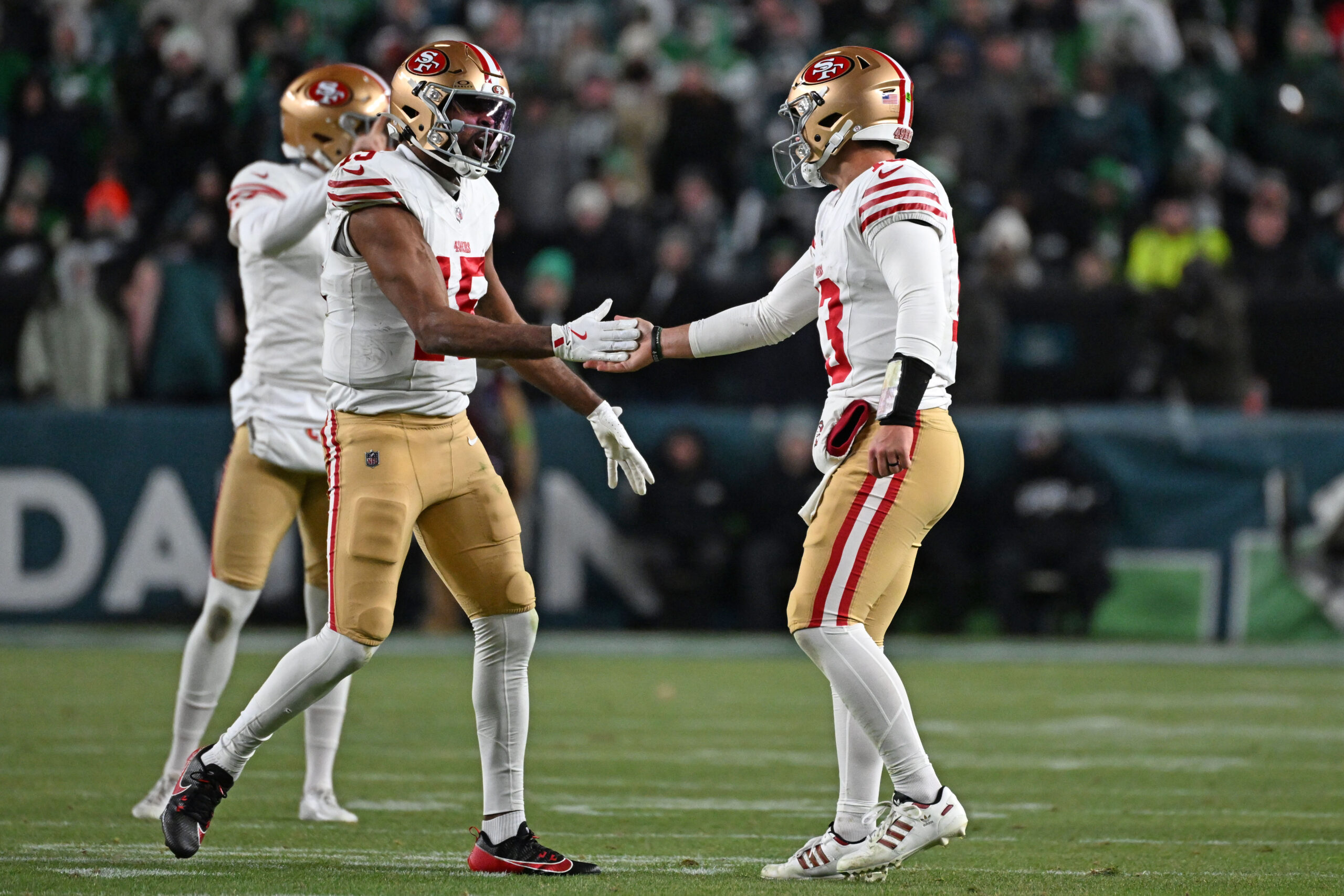 Jan 11, 2026; Philadelphia, PA, USA; San Francisco 49ers wide receiver Jauan Jennings (15) celebrates his touchdown pass with quarterback Brock Purdy (13) during the fourth quarter against the Philadelphia Eagles in an NFC Wild Card Round game at Lincoln Financial Field. Mandatory Credit: Eric Hartline-Imagn Images