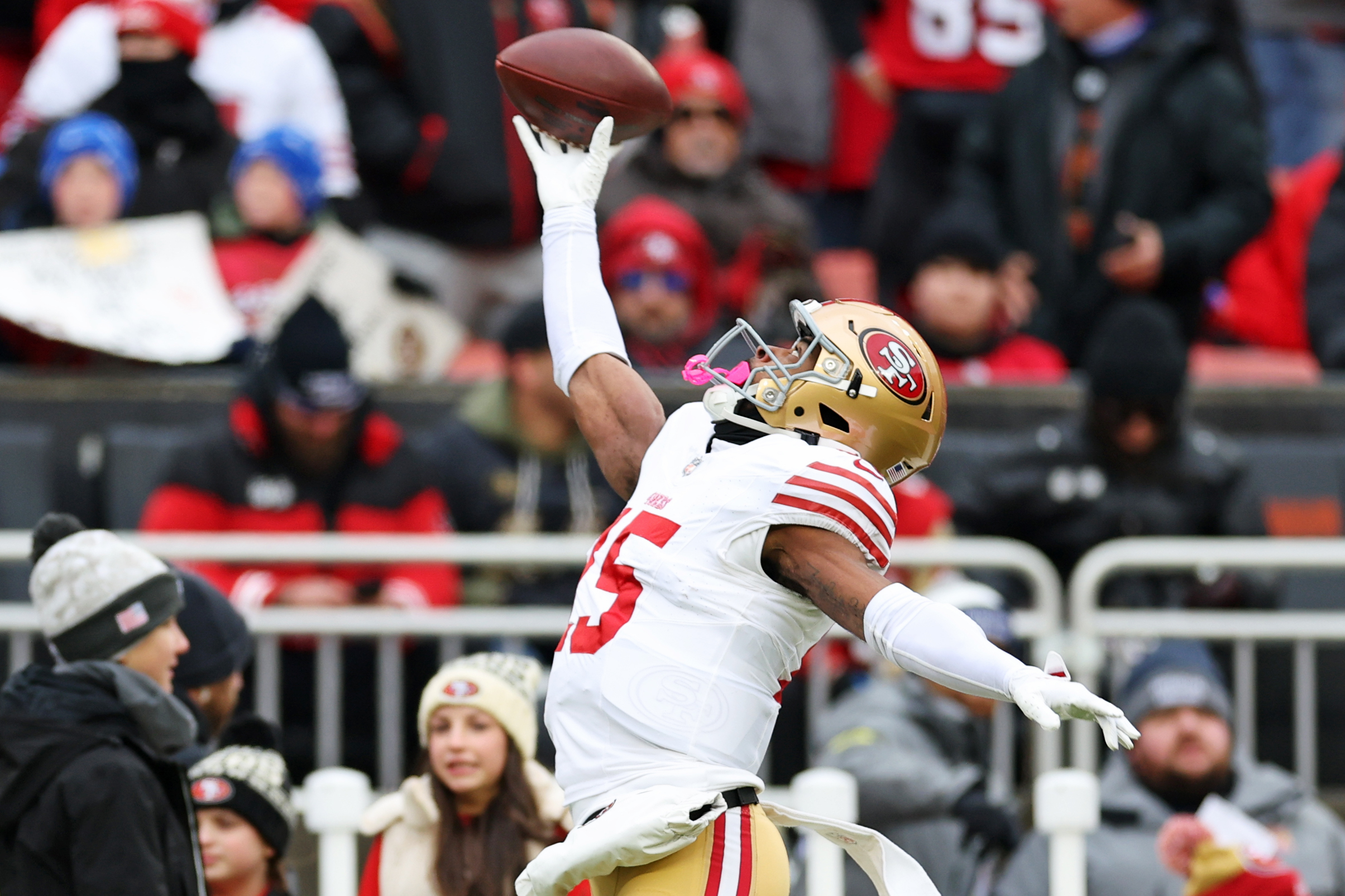 Nov 30, 2025; Cleveland, Ohio, USA; San Francisco 49ers wide receiver Jauan Jennings (15) warms up before the game against the Cleveland Browns at Huntington Bank Field. Mandatory Credit: Scott Galvin-Imagn Images