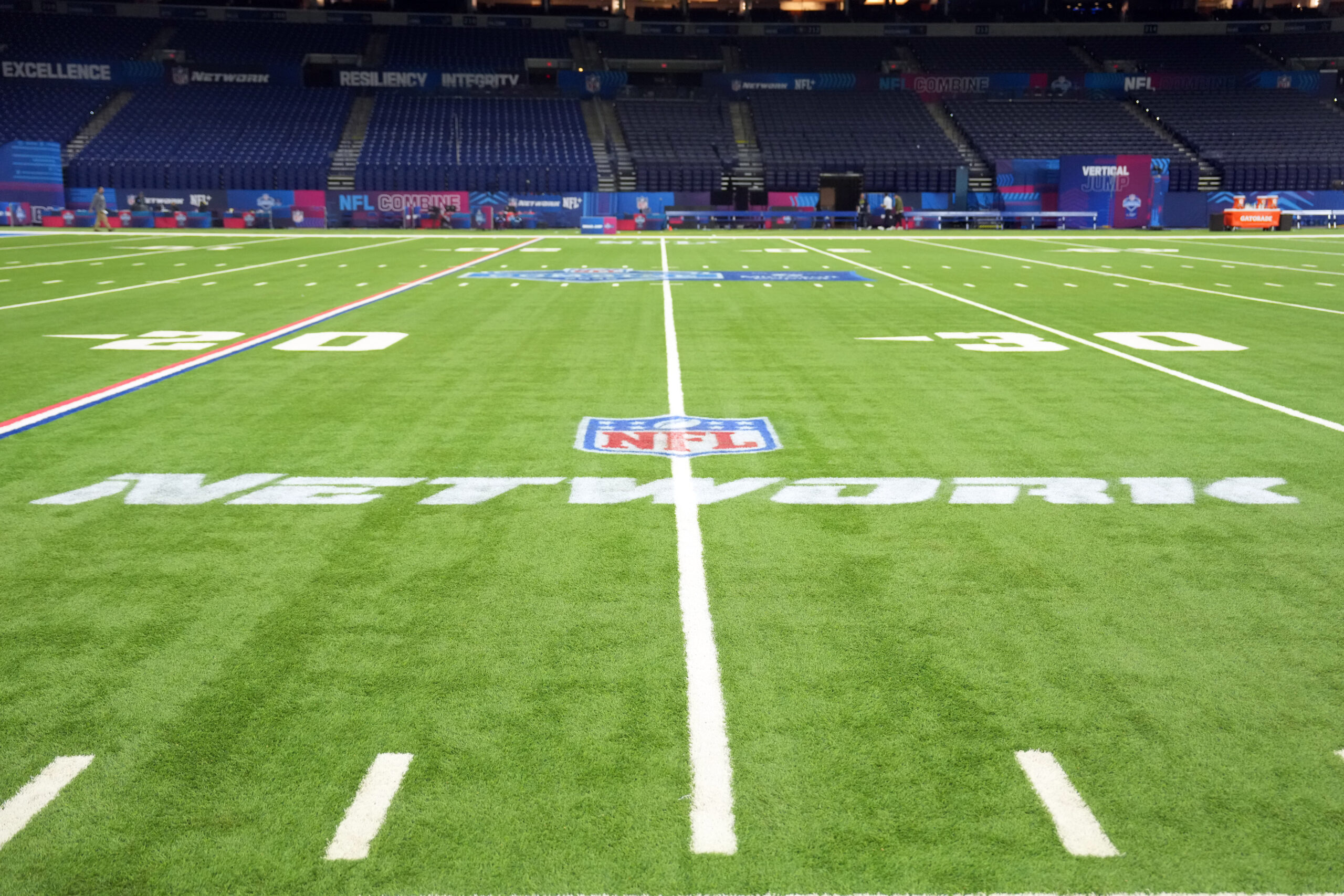 Feb 27, 2026; Indianapolis, IN, USA; The NFL Network logo on the field during the NFL Scouting Combine at Lucas Oil Stadium. Mandatory Credit: Kirby Lee-Imagn Images