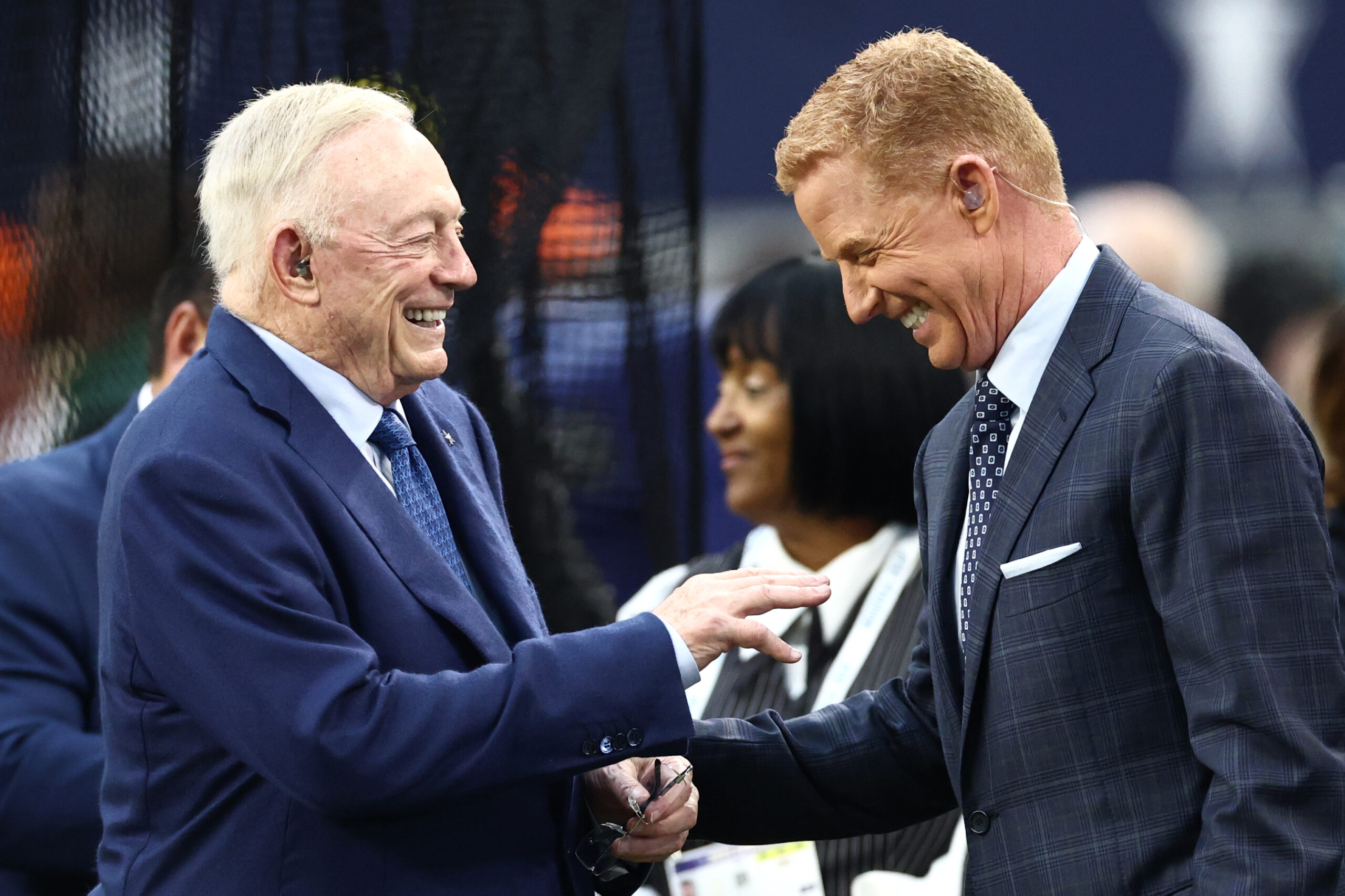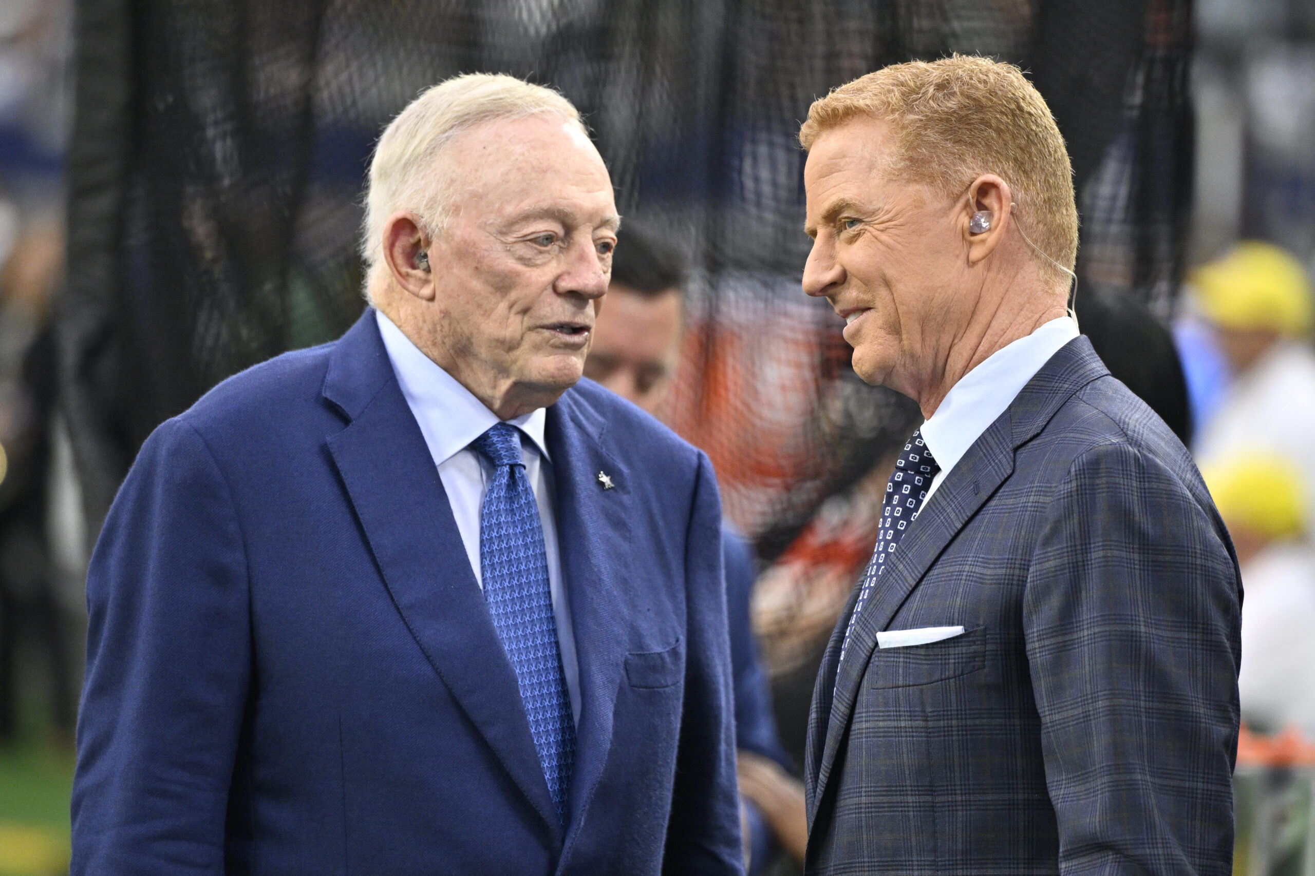 Sep 28, 2025; Arlington, Texas, USA; Dallas Cowboys owner Jerry Jones and NBC commentator Jason Garrett talk before the game against the Green Bay Packers at AT&T Stadium. Mandatory Credit: Kevin Jairaj-Imagn Images