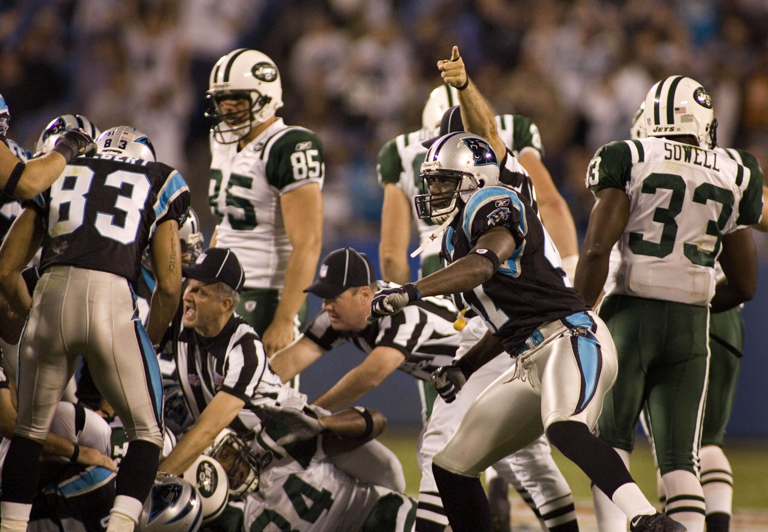 November 13, 2005; Charlotte, NC, USA; Carolina Panthers wide receiver #83 Keary Colbert and Safety #47 Thomas Davis celebrate a New York Jets fumble on the kickoff return with 13:18 to go in the 4th quarter in the Panthers 30-3 victory over the New York Jets at Bank of America Stadium. Mandatory Credit: Bob Donnan-Imagn Images Copyright © 2005 Bob Donnan