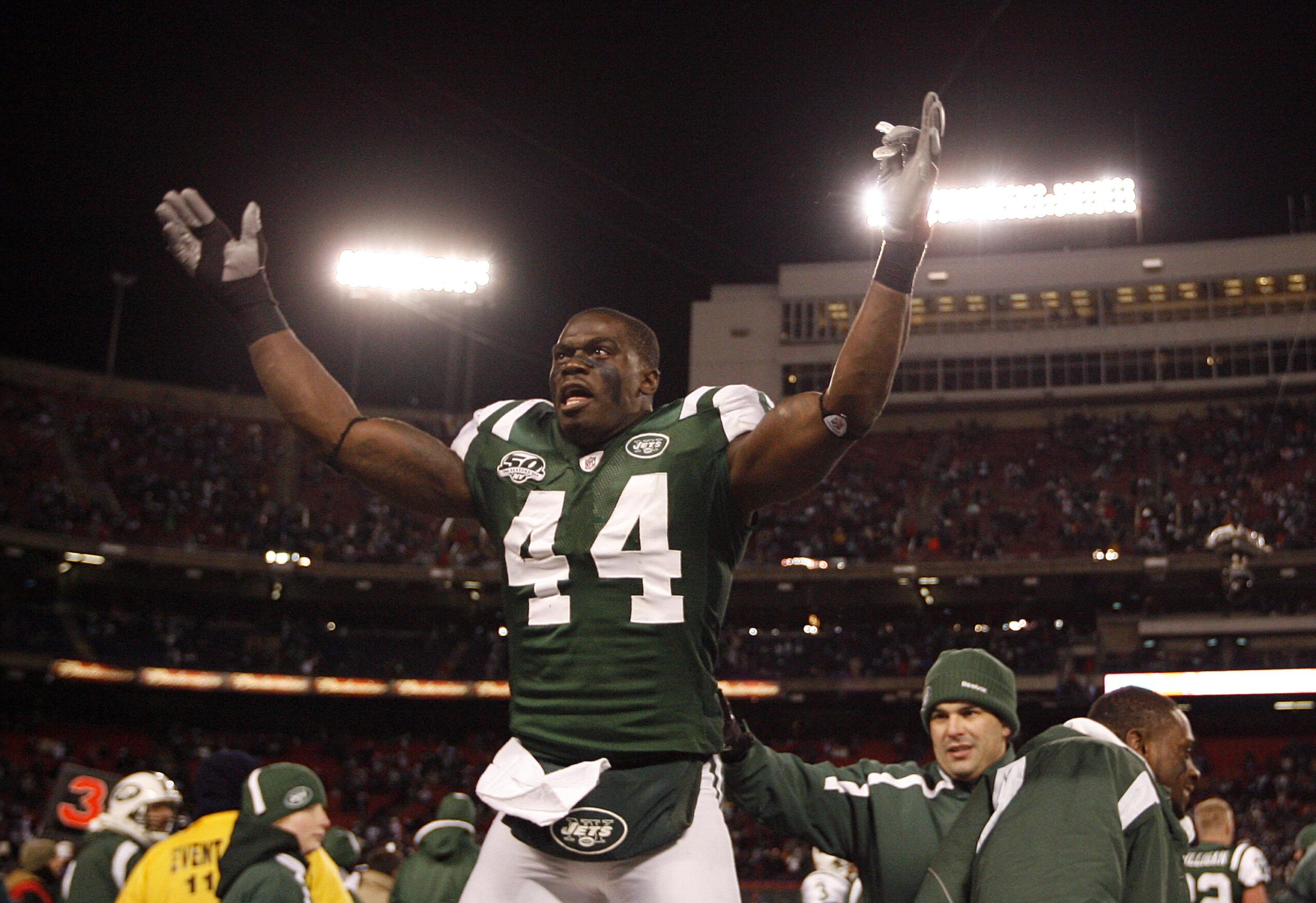 Jan 3, 2010; East Rutherford, NJ, USA; New York Jets cornerback James Ihedigbo (44) gets the crowd going during the second half against the Cincinnati Bengals at Giants Stadium. The Jets clinched a playoff spot with a 37-0 win over the Bengals. Mandatory Credit: Ed Mulholland-Imagn Images