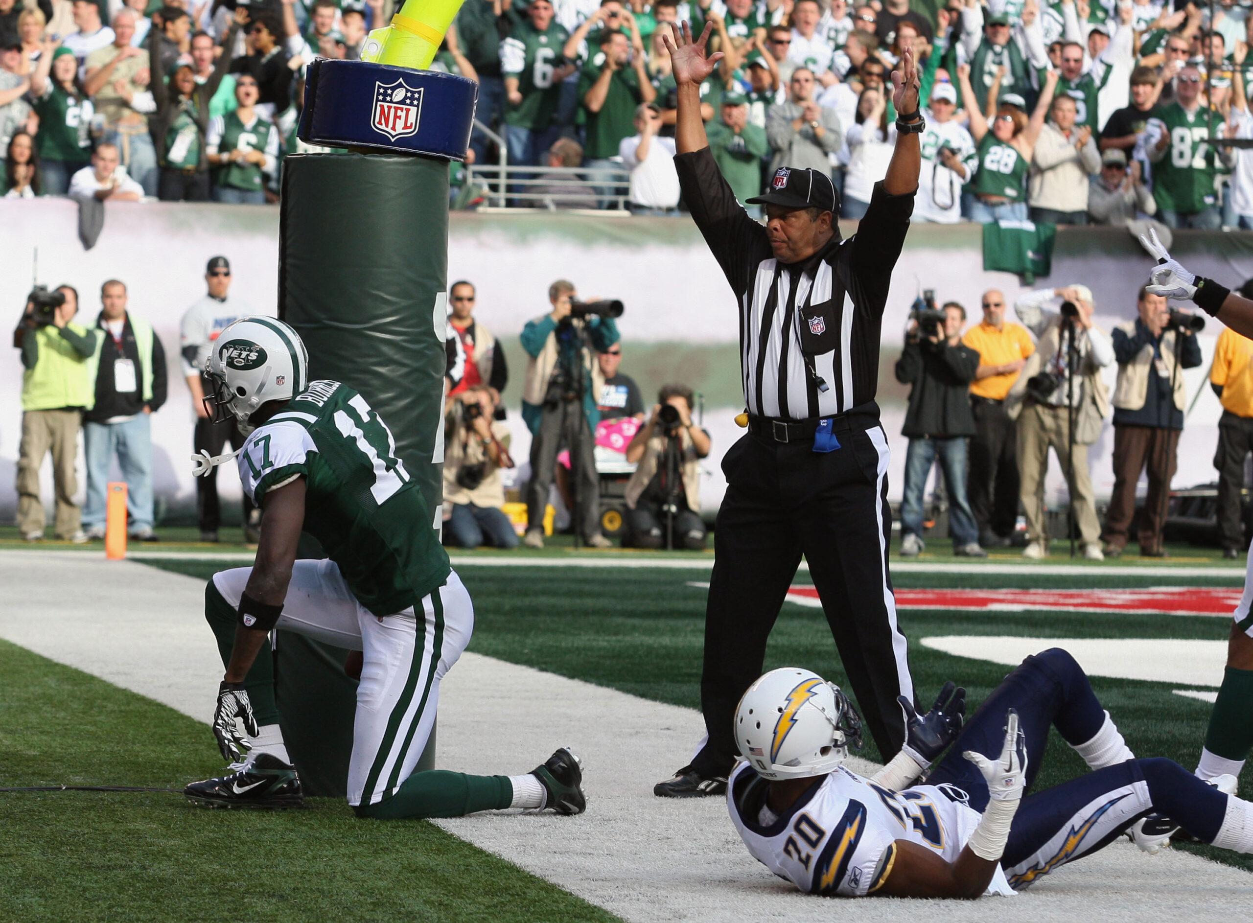 Oct 23, 2011; East Rutherford, NJ, USA; New York Jets wide receiver Plaxico Burress (17) celebrates his go-ahead touchdown catch during the second half at MetLife Stadium. Mandatory Credit: Ed Mulholland-Imagn Images