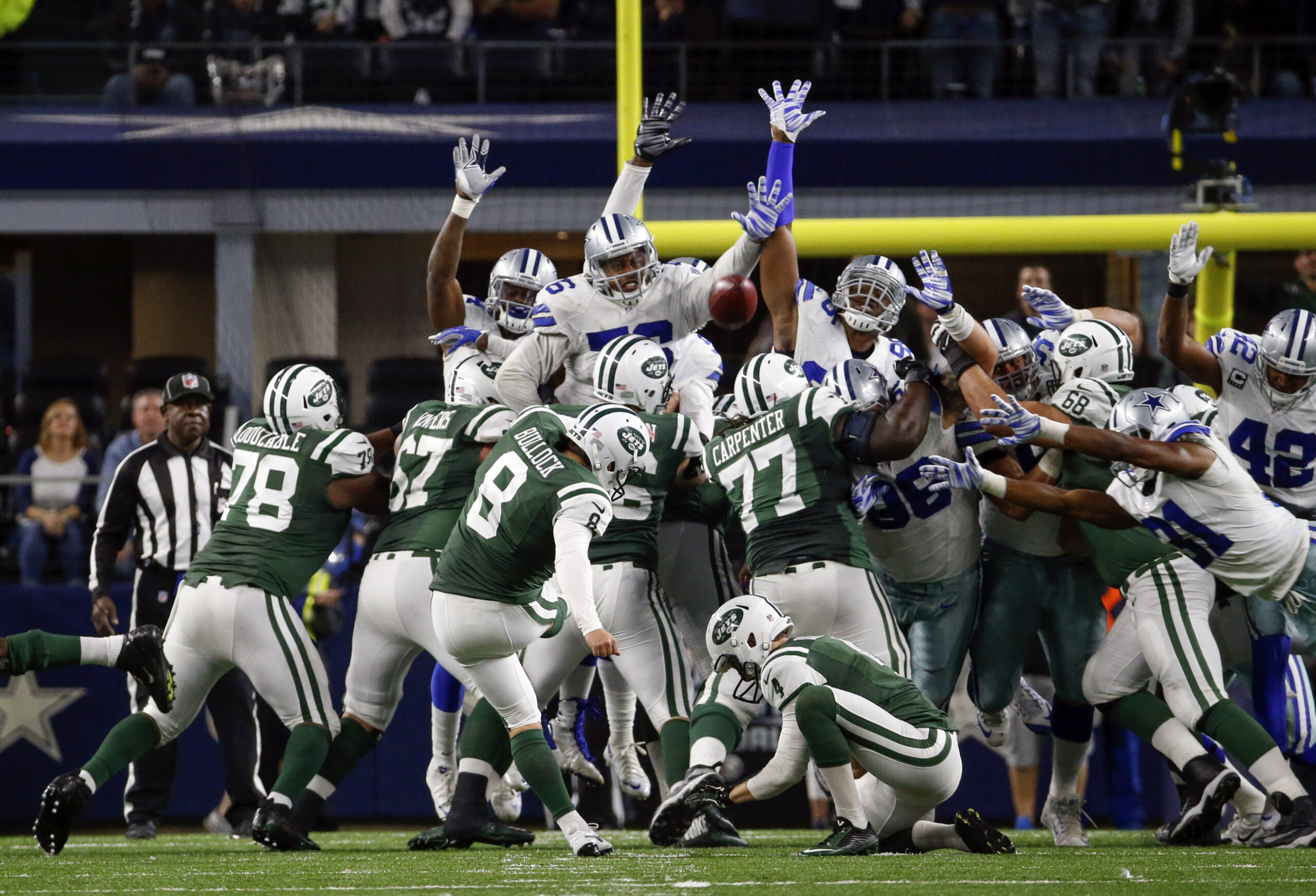 Dec 19, 2015; Arlington, TX, USA; New York Jets kicker Randy Bullock (8) kicks the go ahead field goal during the fourth quarter against the Dallas Cowboys at AT&T Stadium. Mandatory Credit: Kevin Jairaj-Imagn Images