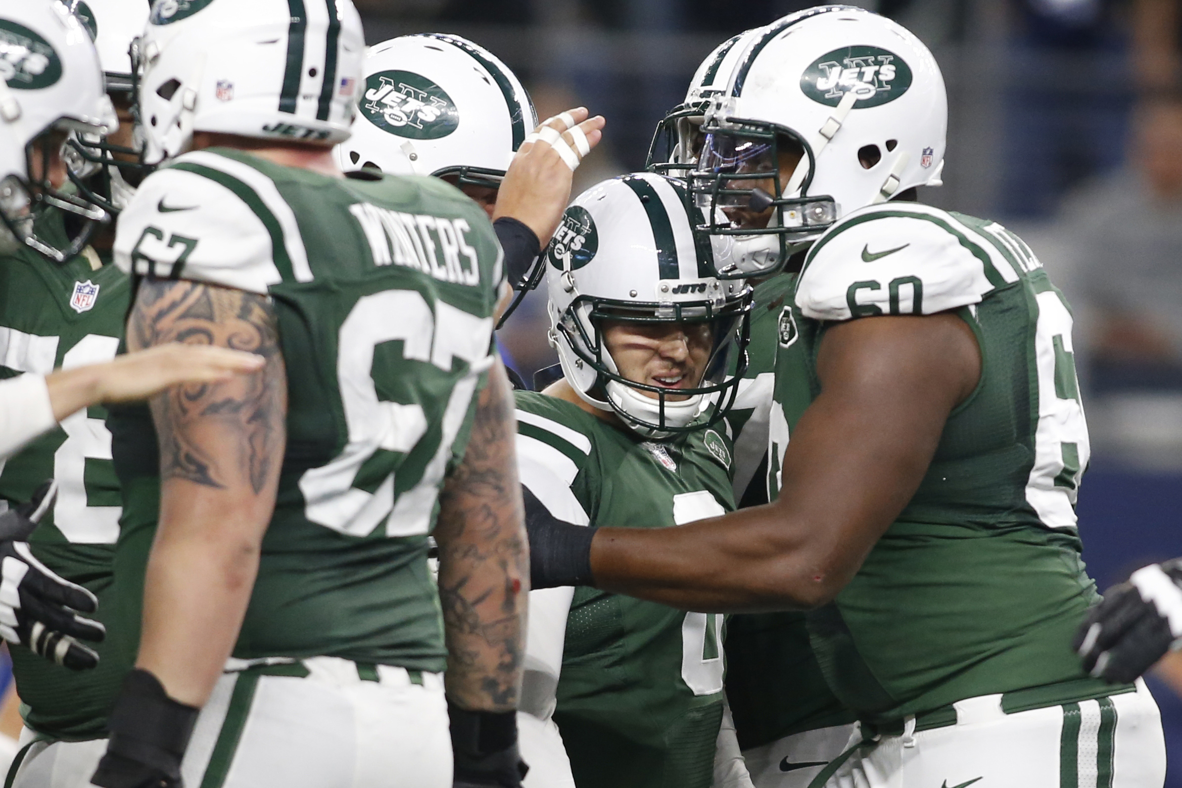 Dec 19, 2015; Arlington, TX, USA; New York Jets kicker Randy Bullock (8) is congratulated by his teammates after kicking a go ahead field goal against the Dallas Cowboys at AT&T Stadium. New York won 19-16. Mandatory Credit: Tim Heitman-Imagn Images