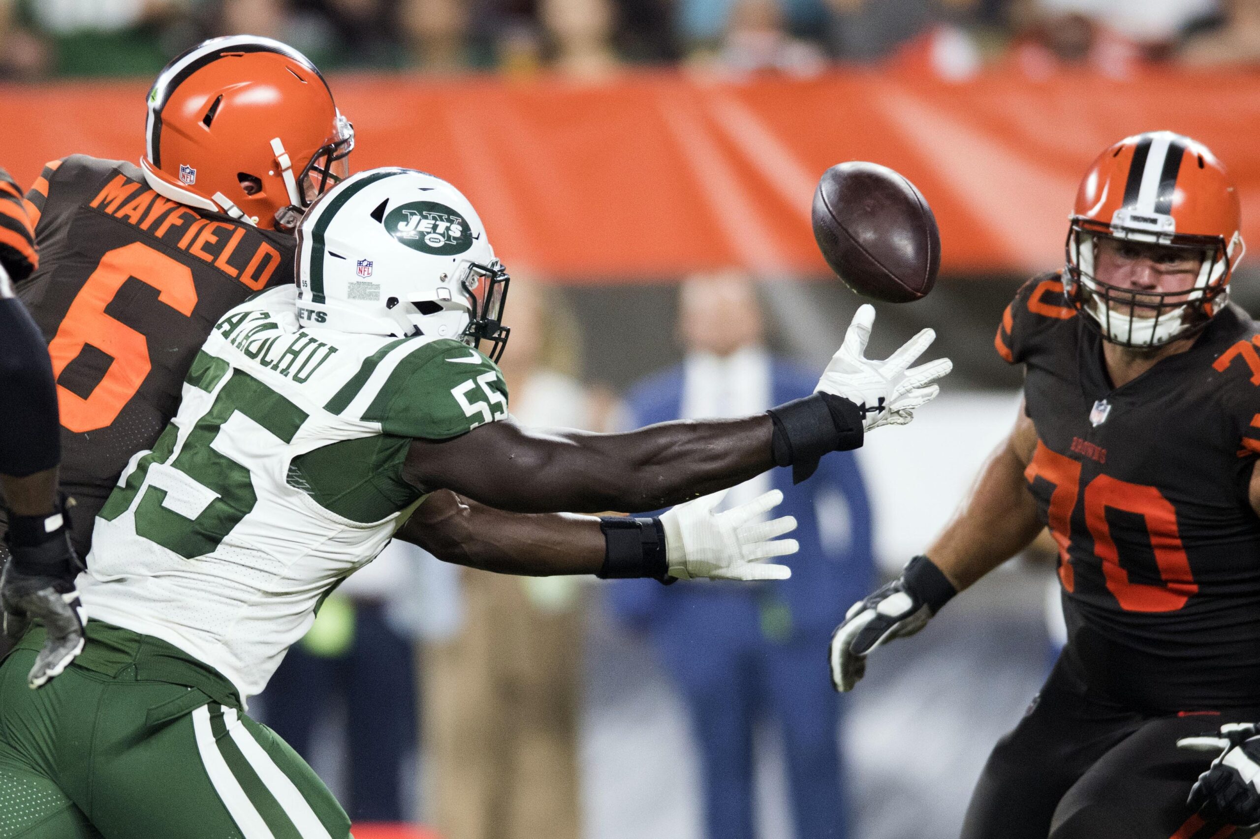 Sep 20, 2018; Cleveland, OH, USA; Cleveland Browns quarterback Baker Mayfield (6) and New York Jets linebacker Jeremiah Attaochu (55) go for a fumbled ball during a two-point conversion attempt during the second half at FirstEnergy Stadium. Mandatory Credit: Ken Blaze-Imagn Images