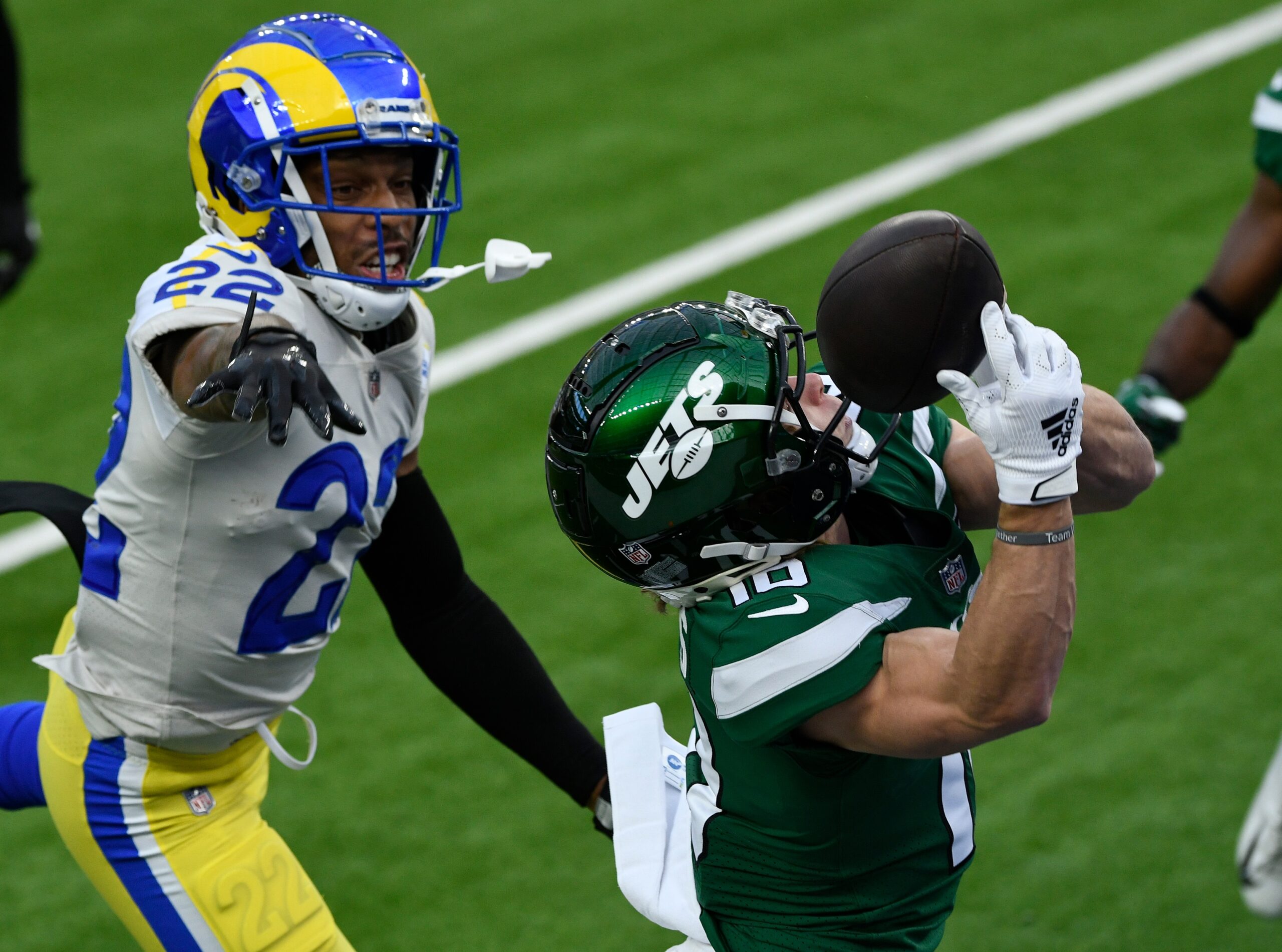Dec 18, 2020; Los Angeles, California, USA; New York Jets wide receiver Jeff Smith (16) has the ball go off his fingertips in the end zone defended by Los Angeles Rams cornerback Troy Hill (22) in the second quarter at SoFi Stadium. Mandatory Credit: Robert Hanashiro-Imagn Images
