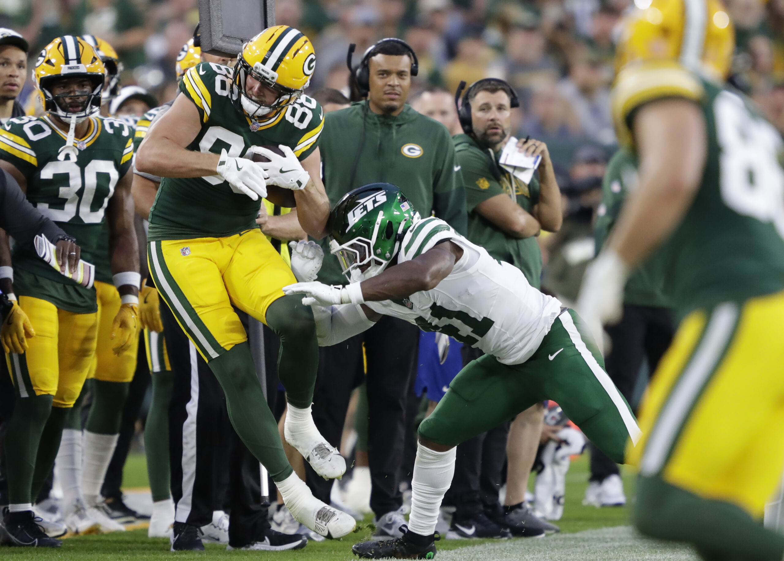 Aug 9, 2025; Green Bay, Wisconsin, USA; Green Bay Packers tight end Luke Musgrave (88) is hit after going out of bounds against New York Jets linebacker Marcelino McCrary-Ball (41) during the second half at Lambeau Field. Mandatory Credit: Dan Powers/USA TODAY NETWORK-Wisconsin/Imagn Images