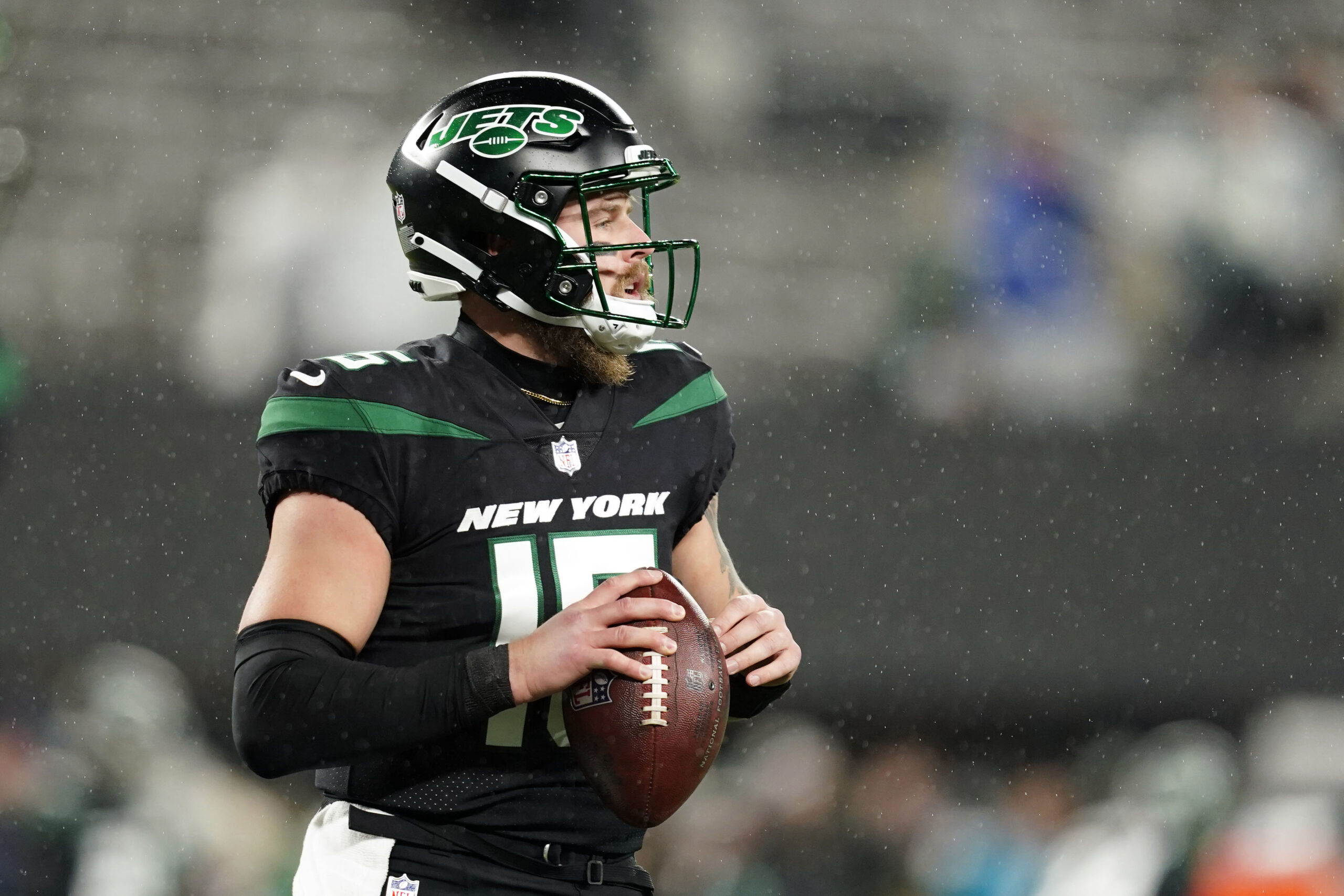 Dec 22, 2022; East Rutherford, New Jersey, USA; New York Jets quarterback Chris Streveler (15) warms up before the game against the Jacksonville Jaguars at MetLife Stadium. Mandatory Credit: Danielle Parhizkaran-Imagn Images