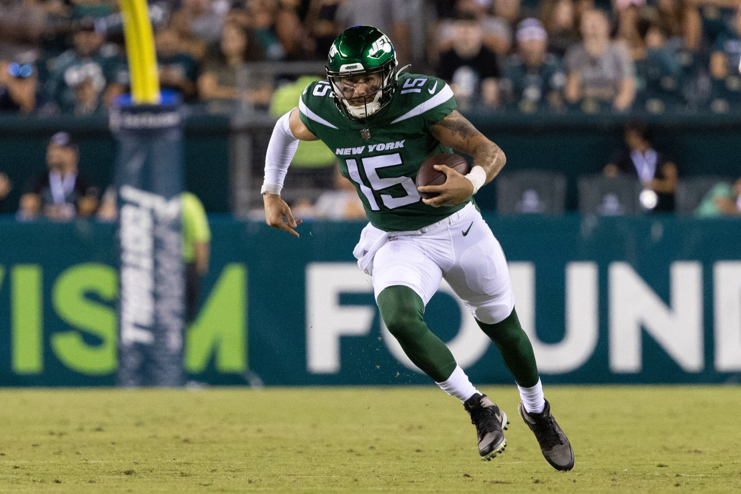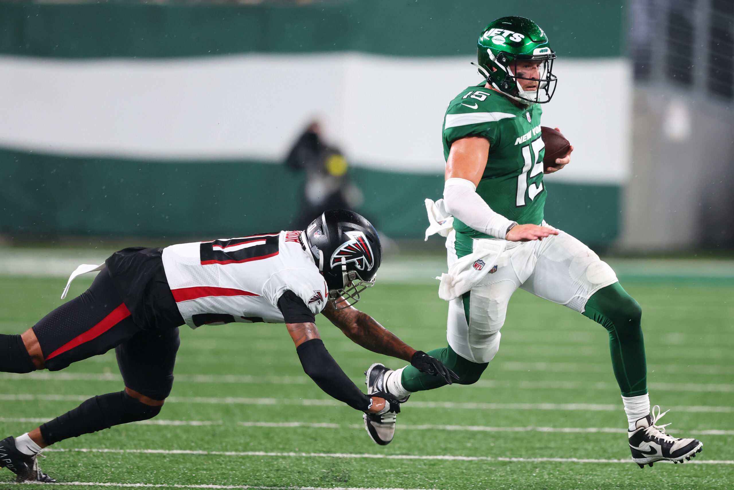 Aug 22, 2022; East Rutherford, New Jersey, USA; New York Jets quarterback Chris Streveler (15) runs with the ball during the second half against the Atlanta Falcons at MetLife Stadium. Mandatory Credit: Ed Mulholland-Imagn Images