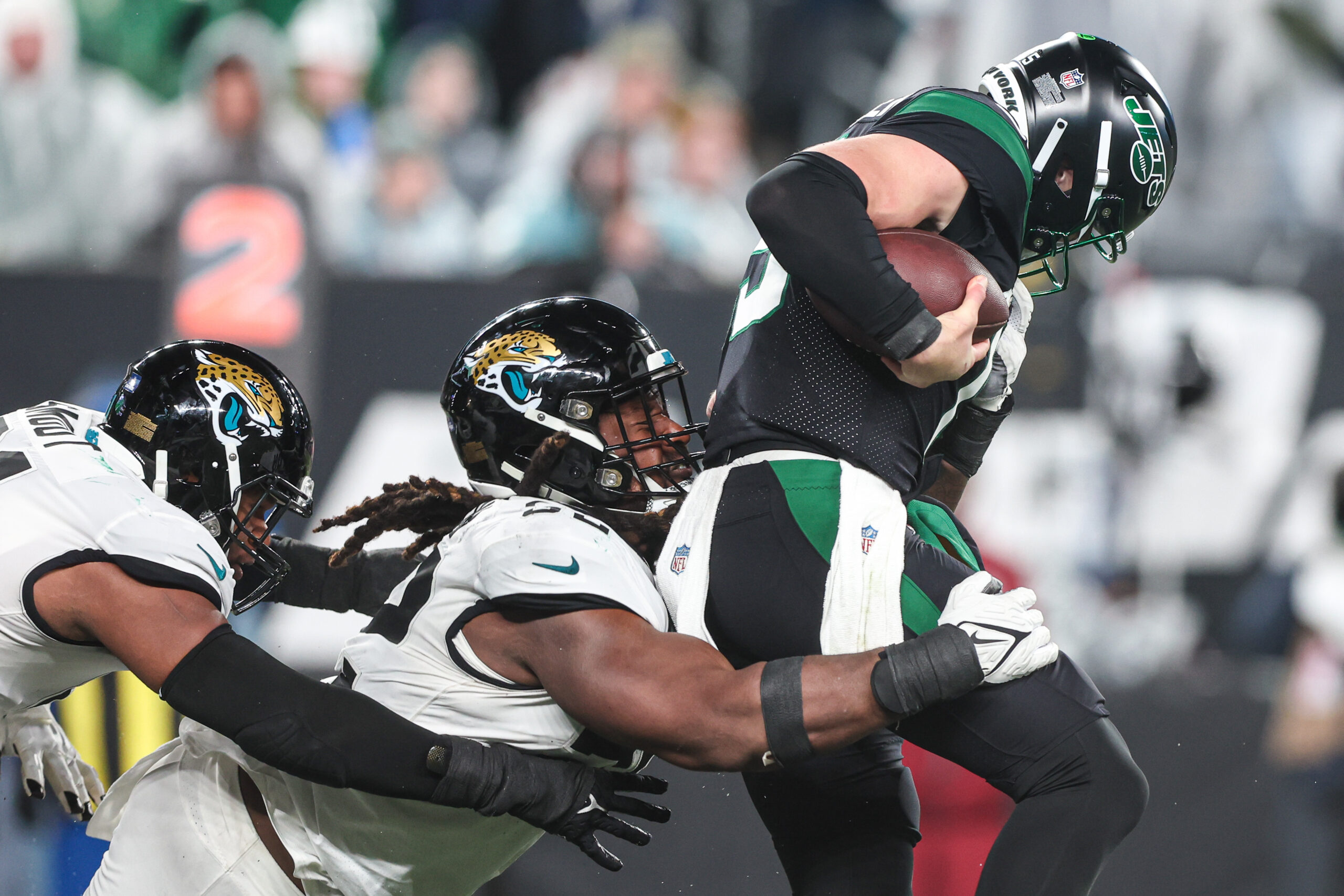 Dec 22, 2022; East Rutherford, New Jersey, USA; New York Jets quarterback Chris Streveler (15) is tackled by Jacksonville Jaguars defensive tackle Corey Peters (98) and defensive end Dawuane Smoot (91) during the second half at MetLife Stadium. Mandatory Credit: Vincent Carchietta-Imagn Images