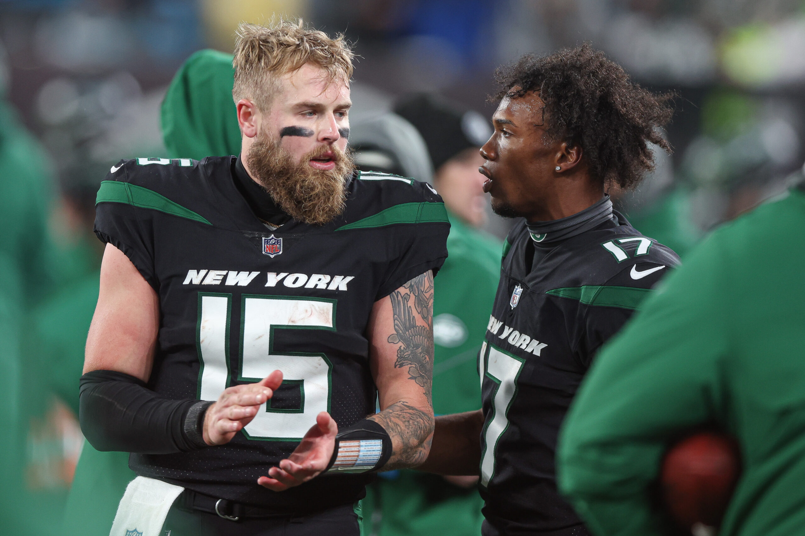 Dec 22, 2022; East Rutherford, New Jersey, USA; New York Jets quarterback Chris Streveler (15) talks with wide receiver Garrett Wilson (17) on the sidelines during the second half against the Jacksonville Jaguars at MetLife Stadium. Mandatory Credit: Vincent Carchietta-Imagn Images