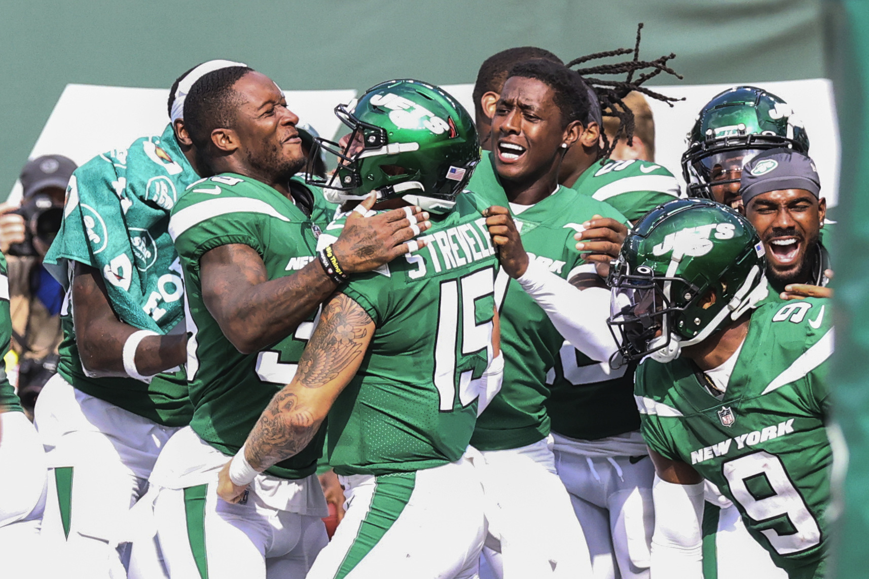 Aug 28, 2022; East Rutherford, New Jersey, USA; New York Jets quarterback Chris Streveler (15) celebrates with this teammates after throwing a touchdown in the second half against the New York Giants at MetLife Stadium. Mandatory Credit: Wendell Cruz-Imagn Images