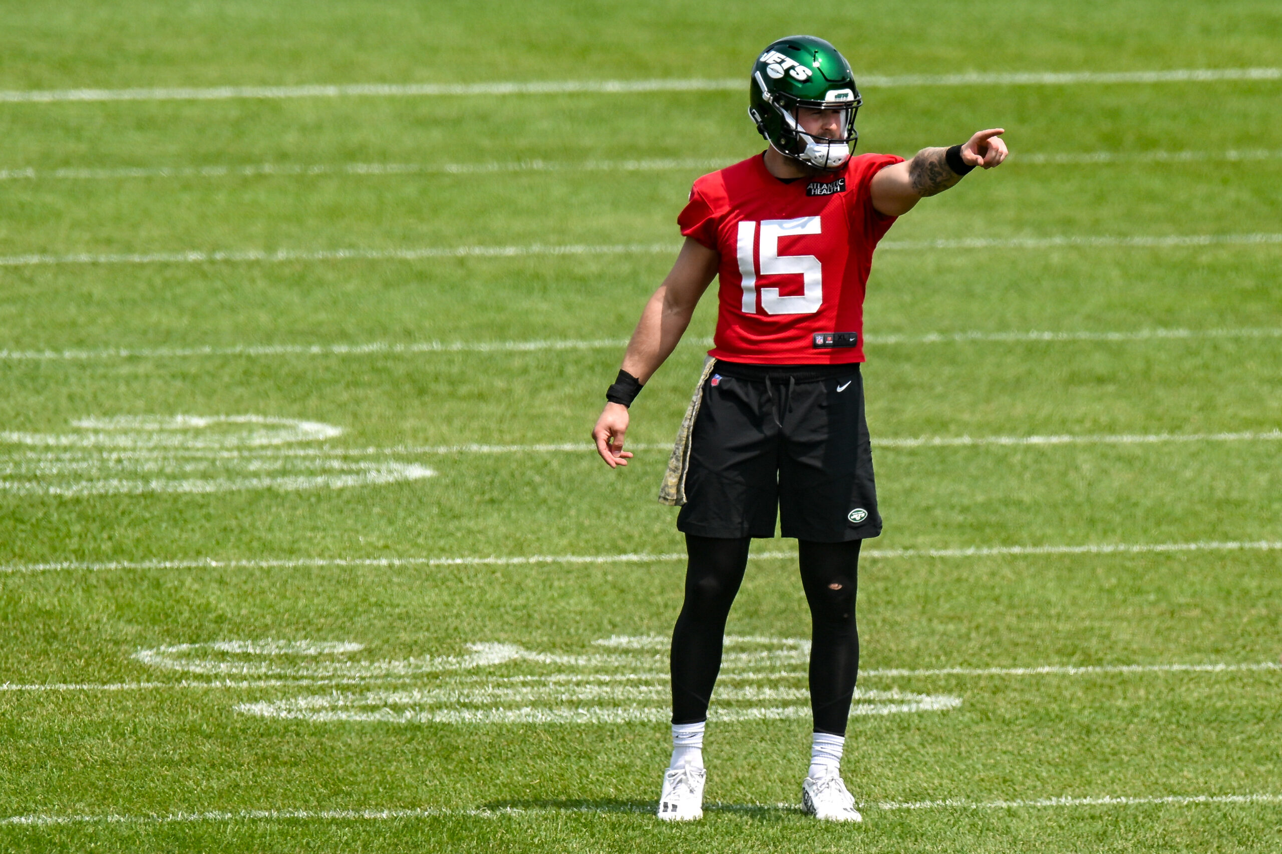 May 23, 2023; Florham Park, NJ, USA; New York Jets quarterback Chris Streveler (15) practices a drill during OTA s at Atlantic Health Jets Training Center. Mandatory Credit: Jonathan Jones-Imagn Images