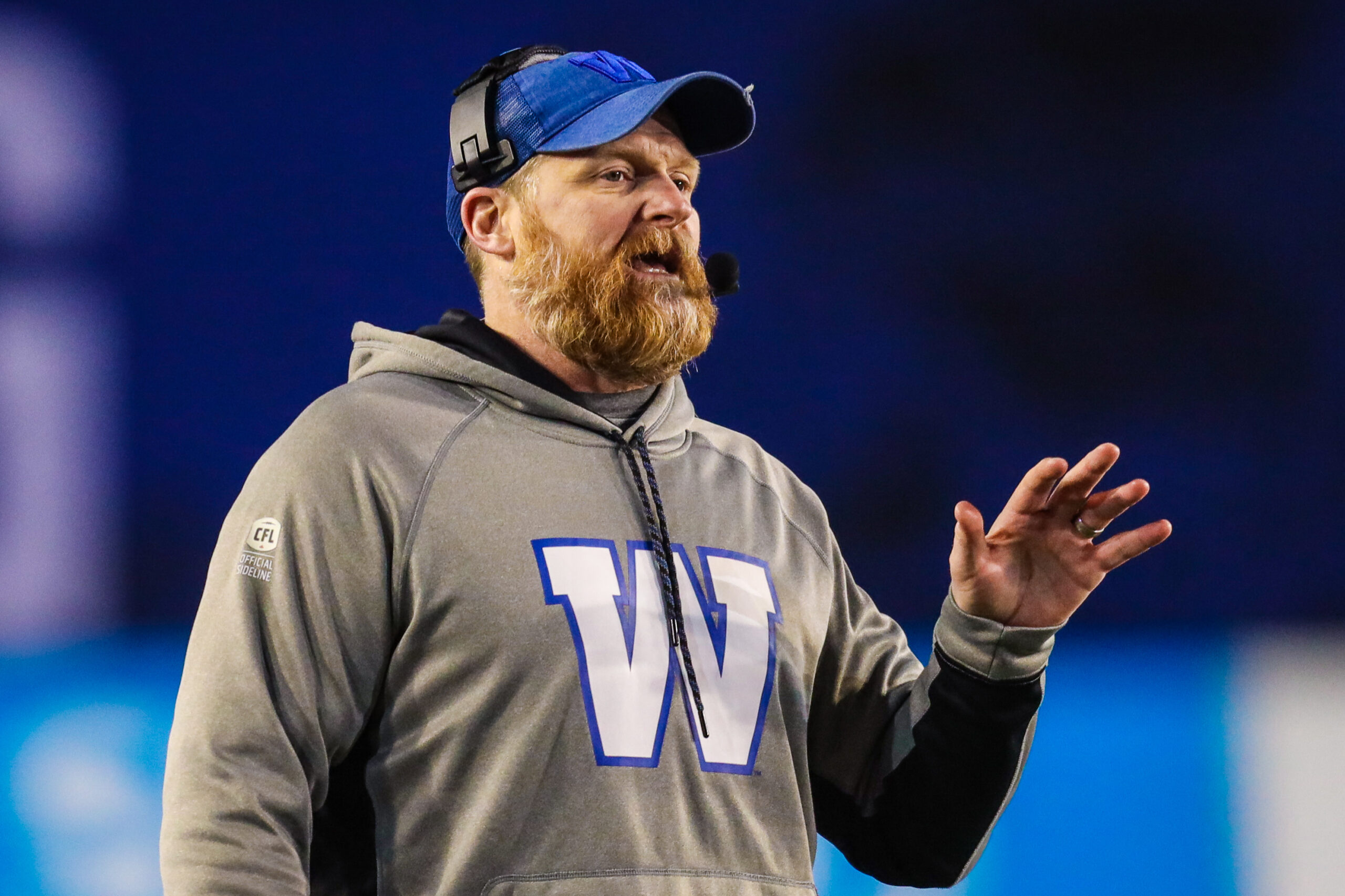 Nov 24, 2019; Calgary, Alberta, CAN; Winnipeg Blue Bombers head coach Mike O’Shea against the Hamilton Tiger-Cats in the first half during the 107th Grey Cup championship football game at McMahon Stadium. Mandatory Credit: Sergei Belski-Imagn Images