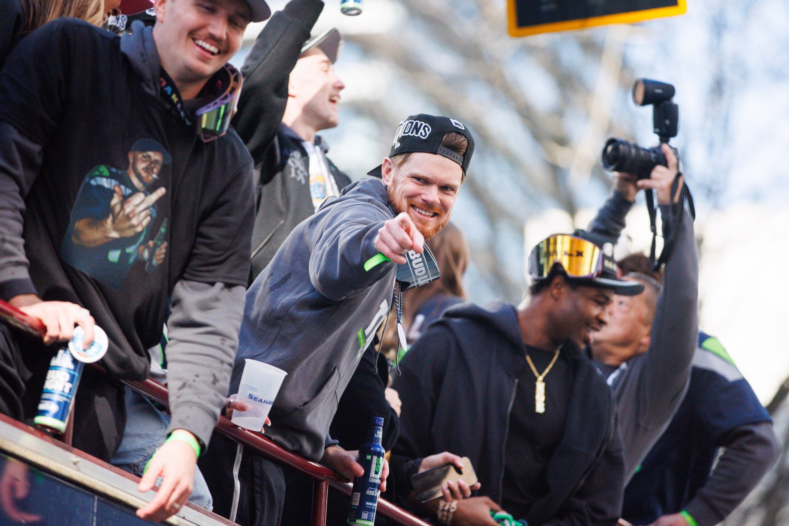 Feb 11, 2026; Seattle, WA, USA; Seattle Seahawks quarterback Sam Darnold (14) reacts during the Super Bowl LX parade. Mandatory Credit: Kevin Ng-Imagn Images