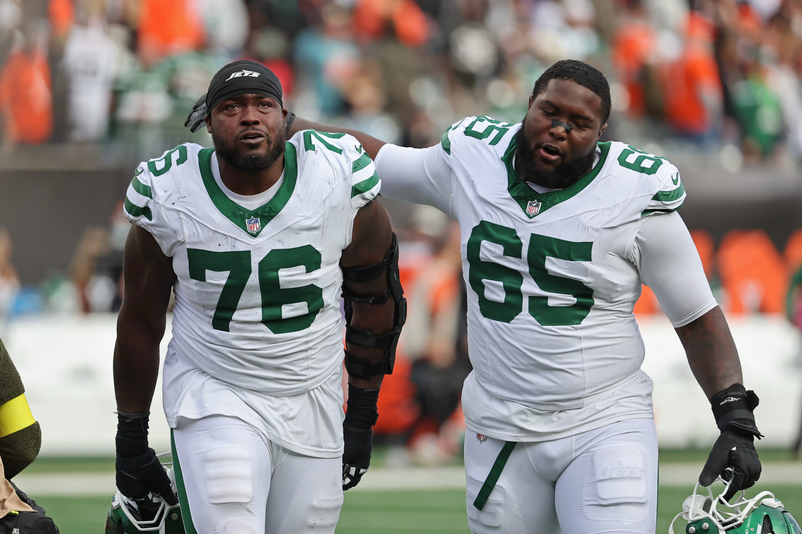 Oct 26, 2025; Cincinnati, Ohio, USA; New York Jets guard John Simpson (76) and guard Xavier Newman (65) walks off the court after winning the game against the Cincinnati Bengals at Paycor Stadium. Mandatory Credit: Joseph Maiorana-Imagn Images