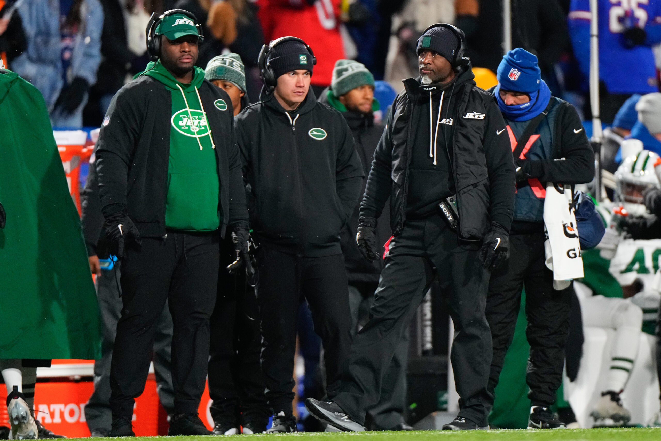 Jan 4, 2026; Orchard Park, New York, USA; New York Jets head coach Aaron Glenn looks on during the second half against the Buffalo Bills at Highmark Stadium. Mandatory Credit: Mark Konezny-Imagn Images