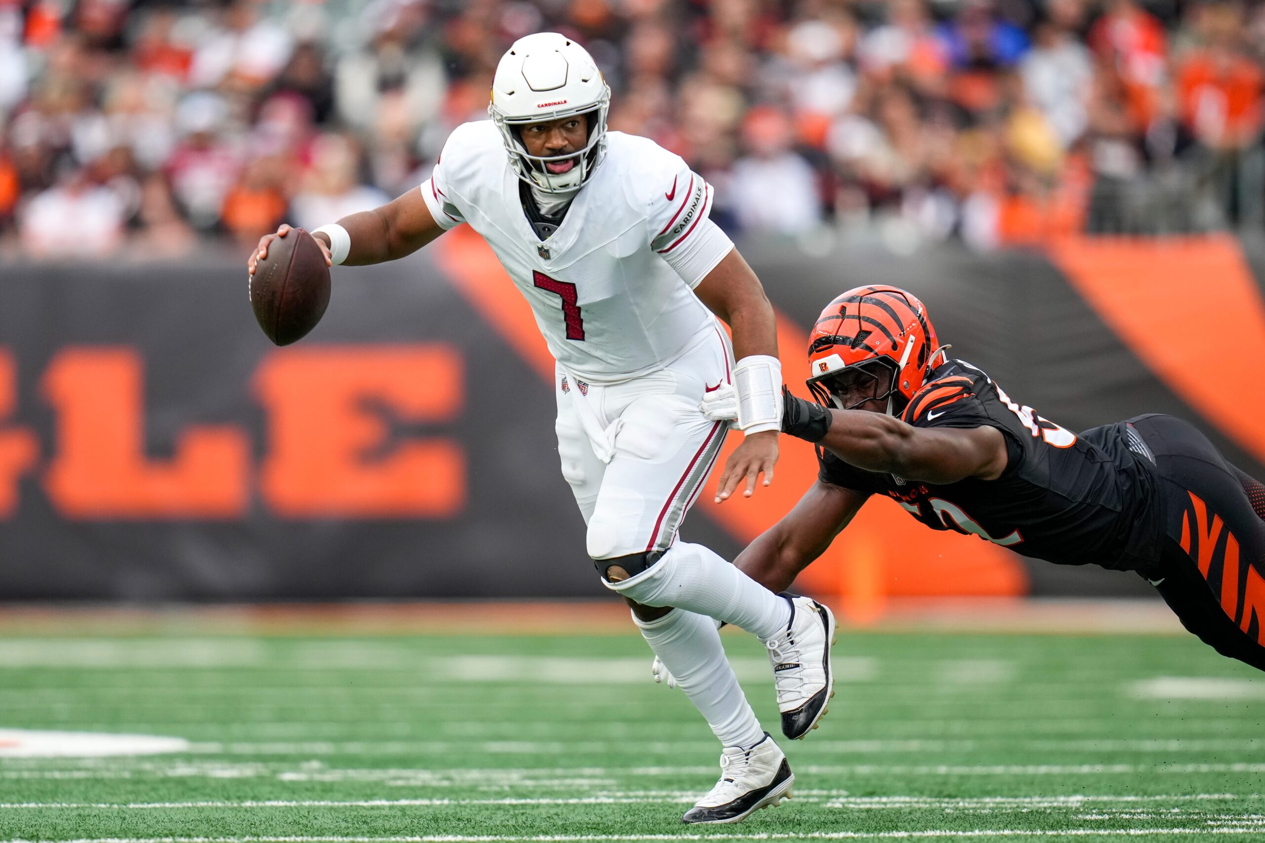 Arizona Cardinals quarterback Jacoby Brissett (7) evades Cincinnati Bengals defensive end Cedric Johnson (52) in the fourth quarter of the NFL Week 17 game between the Cincinnati Bengals and the Arizona Cardinals at Paycor Stadium in Downtown Cincinnati on Sunday, Dec. 28, 2025. The Bengals won 37-14.