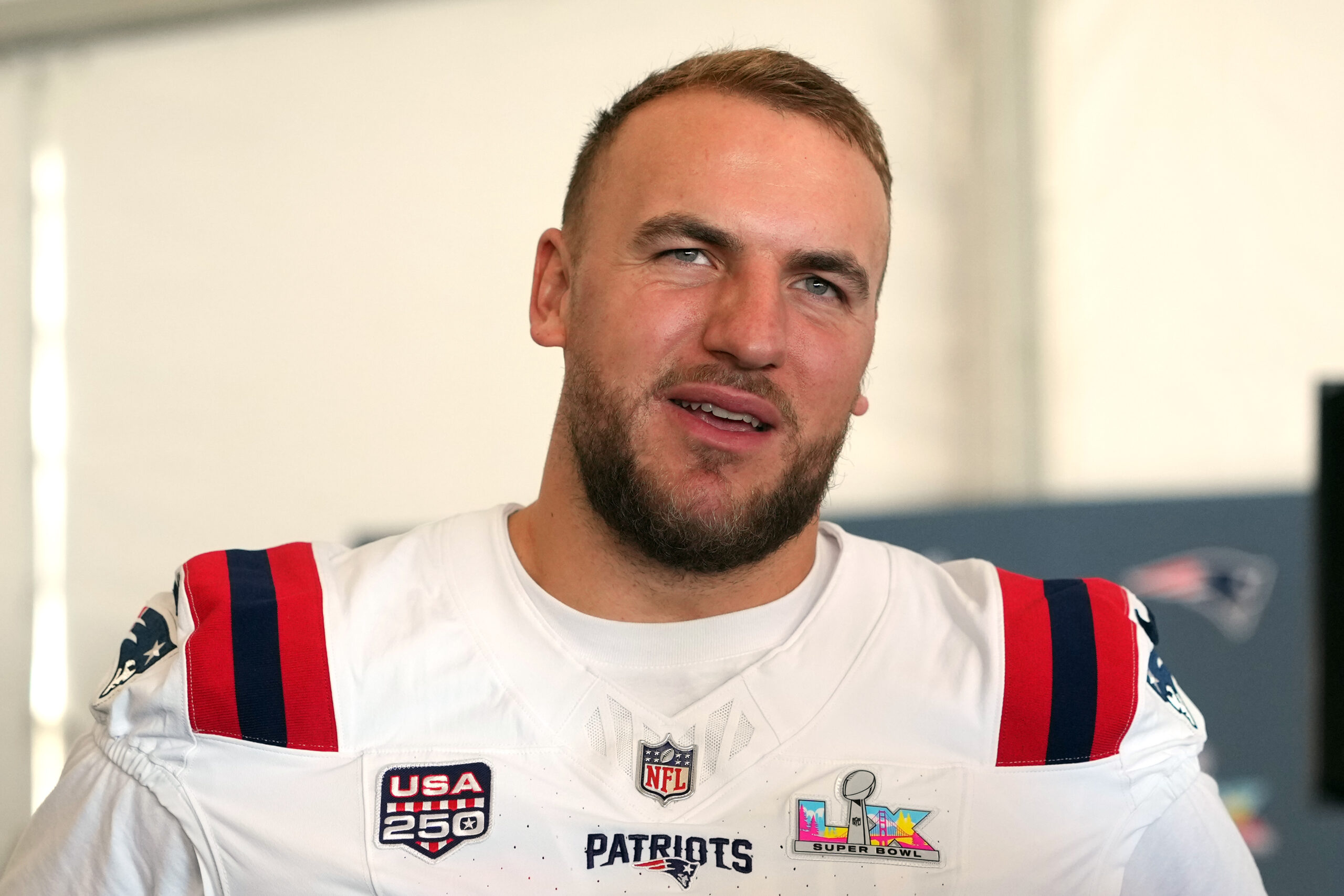 Feb 5, 2026; Santa Clara, CA, USA; New England Patriots offensive tackle Yasir Durant (72) talks to media members at the Santa Clara Marriott. Mandatory Credit: Darren Yamashita-Imagn Images