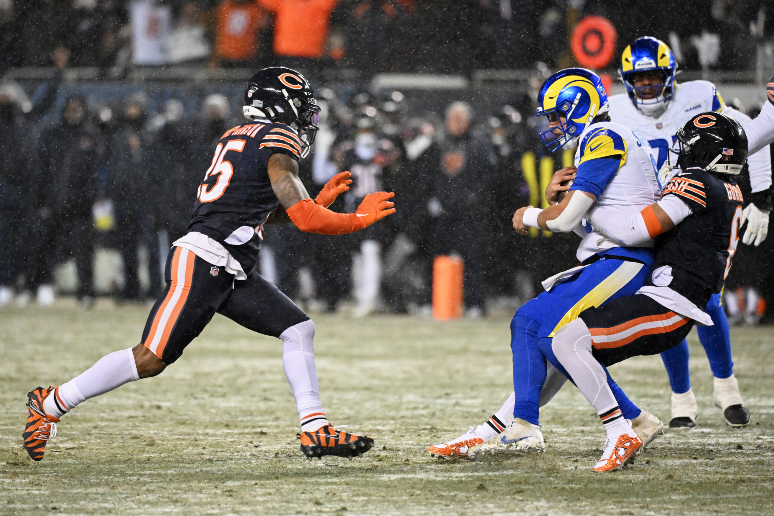 Jan 18, 2026; Chicago, IL, USA; Chicago Bears cornerback Kyler Gordon (6) sacks Los Angeles Rams quarterback Matthew Stafford (9) during the second quarter of an NFC Divisional Round game at Soldier Field. Mandatory Credit: Matt Marton-Imagn Images