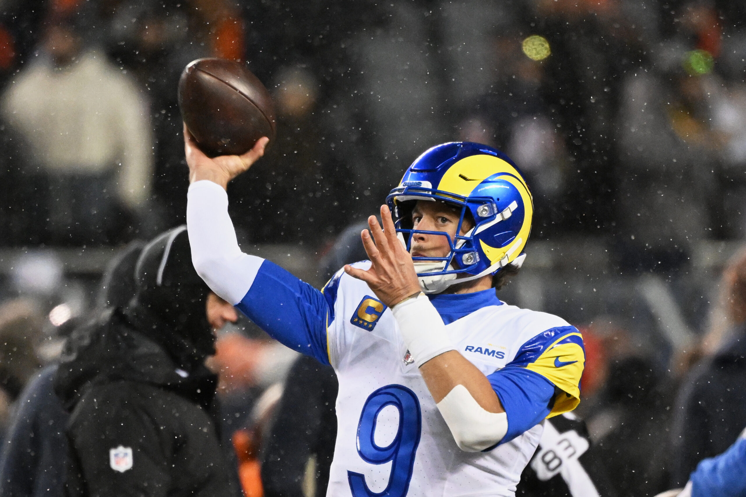 Jan 18, 2026; Chicago, IL, USA; Los Angeles Rams quarterback Matthew Stafford (9) throws a pass during warmups before an NFC Divisional Round game against the Chicago Bears at Soldier Field. Mandatory Credit: Matt Marton-Imagn Images