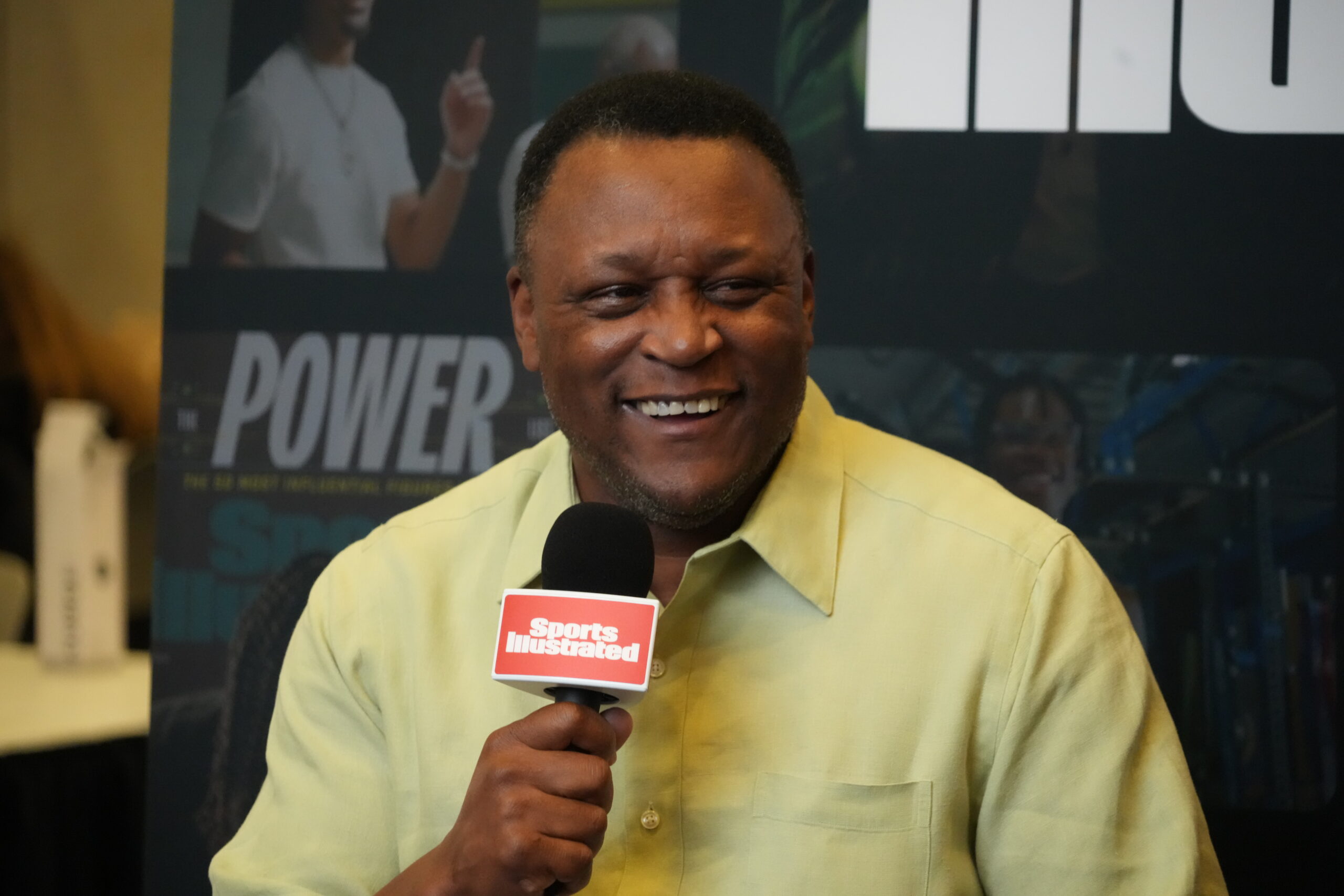 Feb 6, 2026; San Francisco, CA, USA; Barry Sanders on radio row at the Super Bowl LX media center at the Moscone Center. Mandatory Credit: Kirby Lee-Imagn Images