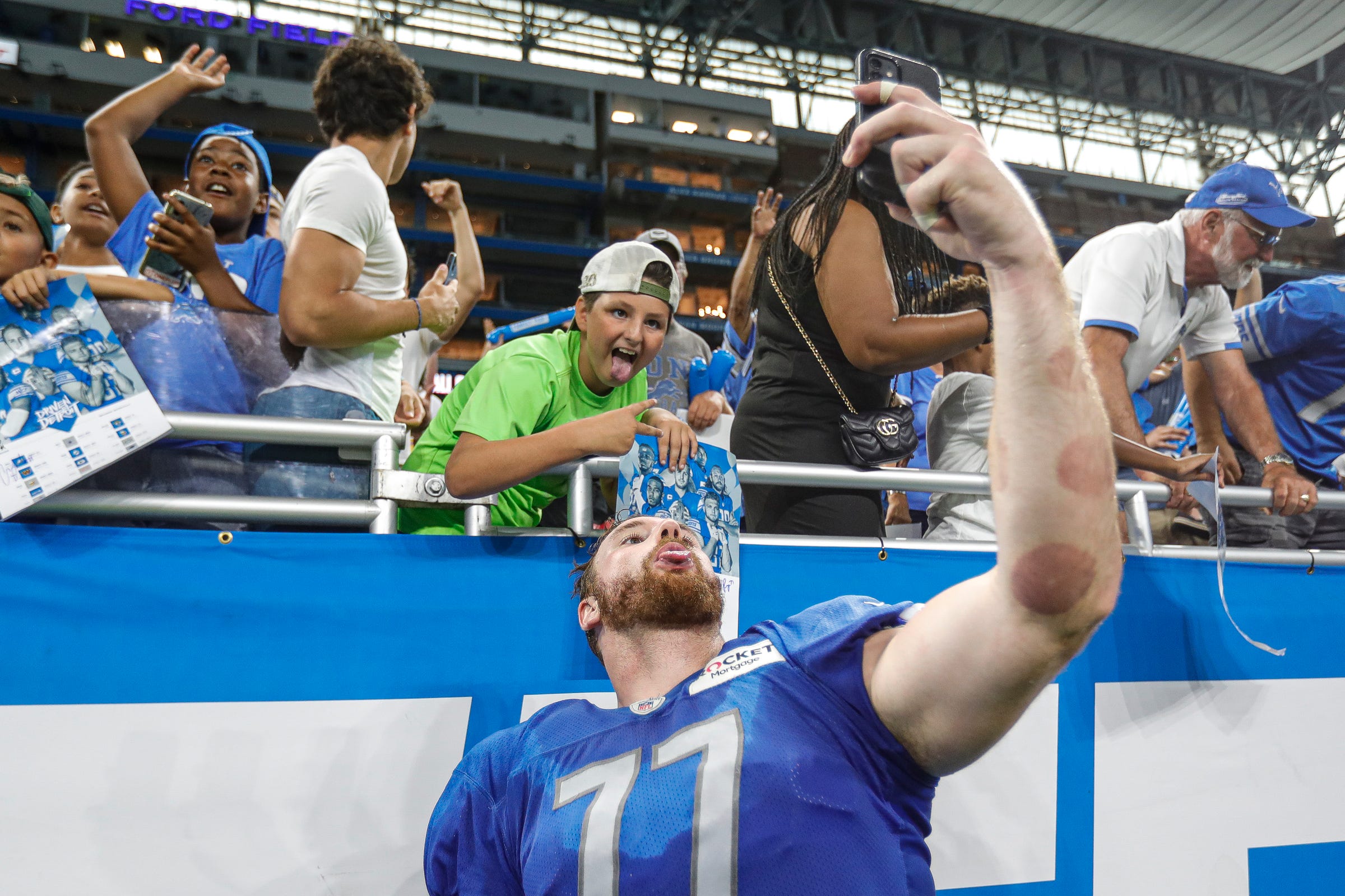 Detroit Lions center Frank Ragnow takes a selfie with fans after open practice at Family Fest at Ford Field in Detroit on Saturday, Aug. 6, 2022.-Imagn Images