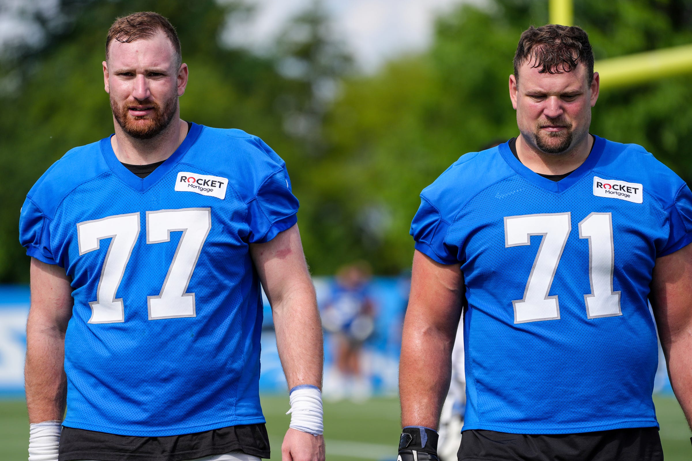 Frank Ragnow and Kevin Zeitler walk off the field together during day two of the Detroit Lions training camp at the Detroit Lions Headquarters in Dearborn, Mich. on Thursday, July 25, 2024.-Imagn Images