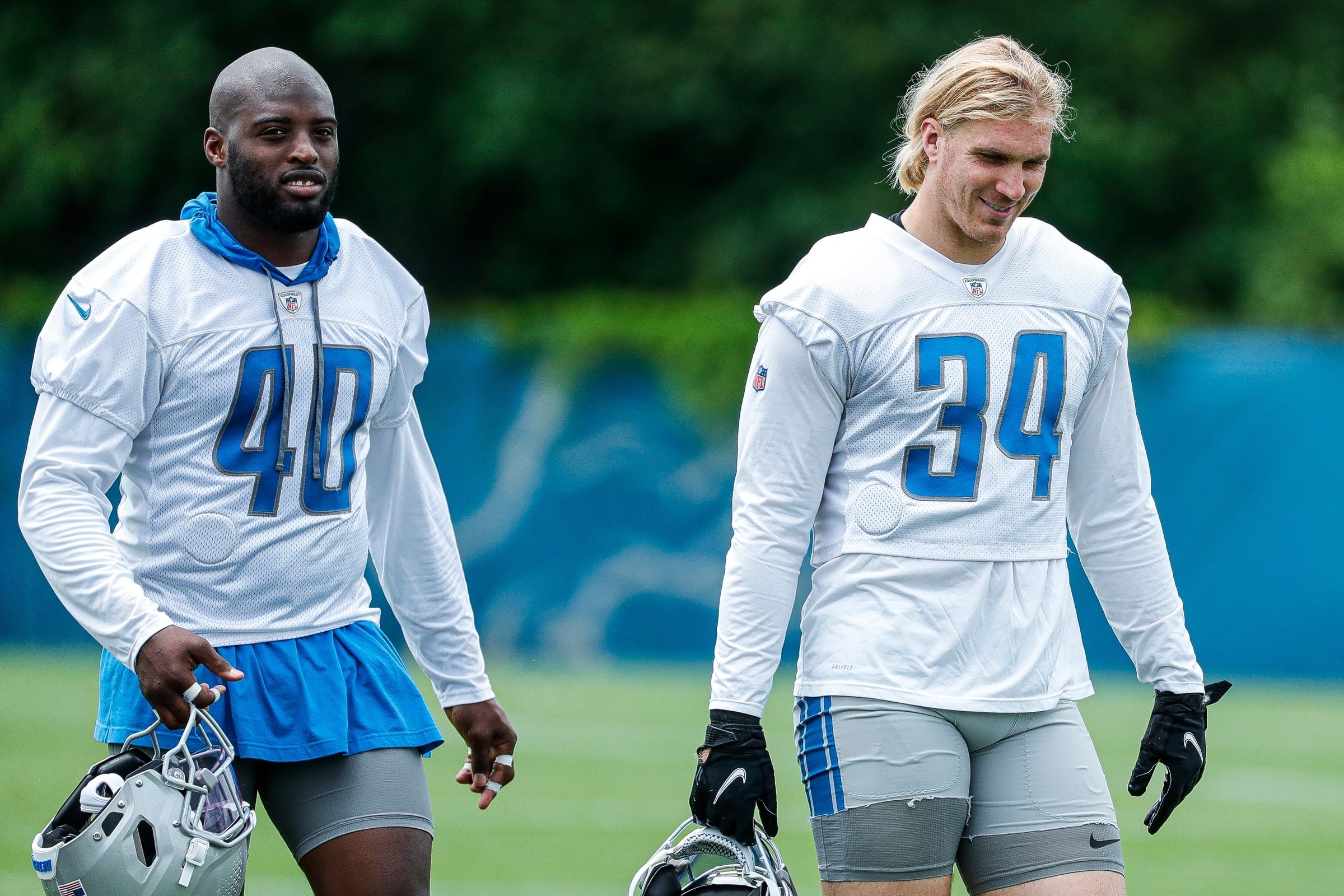 Lions linebacker Jarrad Davis, left, and linebacker Alex Anzalone walk off the field after practice during minicamp in Allen Park on Wednesday, June 8, 2022.-Imagn Images