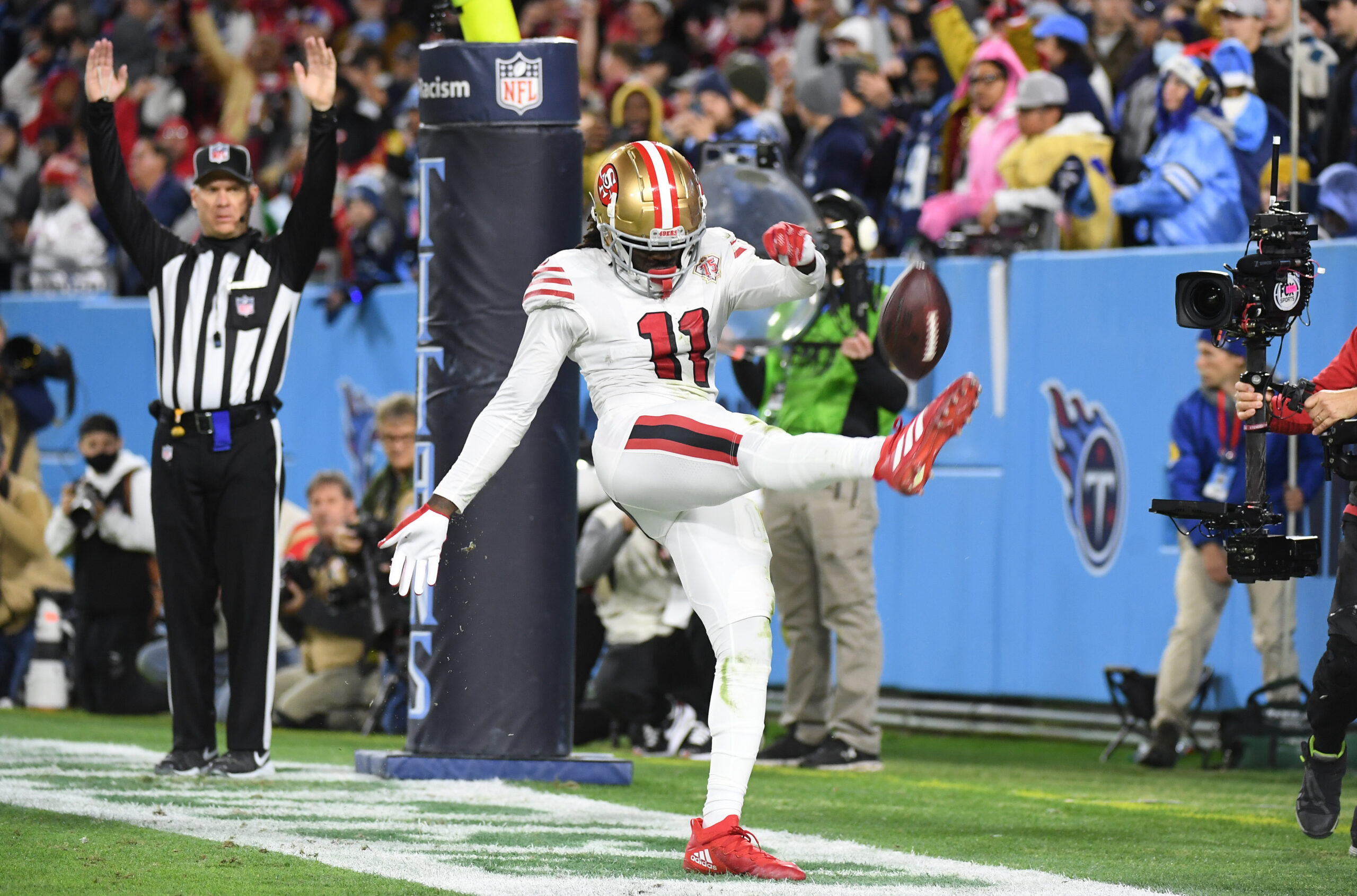 Dec 23, 2021; Nashville, Tennessee, USA; San Francisco 49ers wide receiver Brandon Aiyuk (11) kicks the ball into the stands after catching a touchdown pass during the second half against the Tennessee Titans at Nissan Stadium. Mandatory Credit: Christopher Hanewinckel-Imagn Images