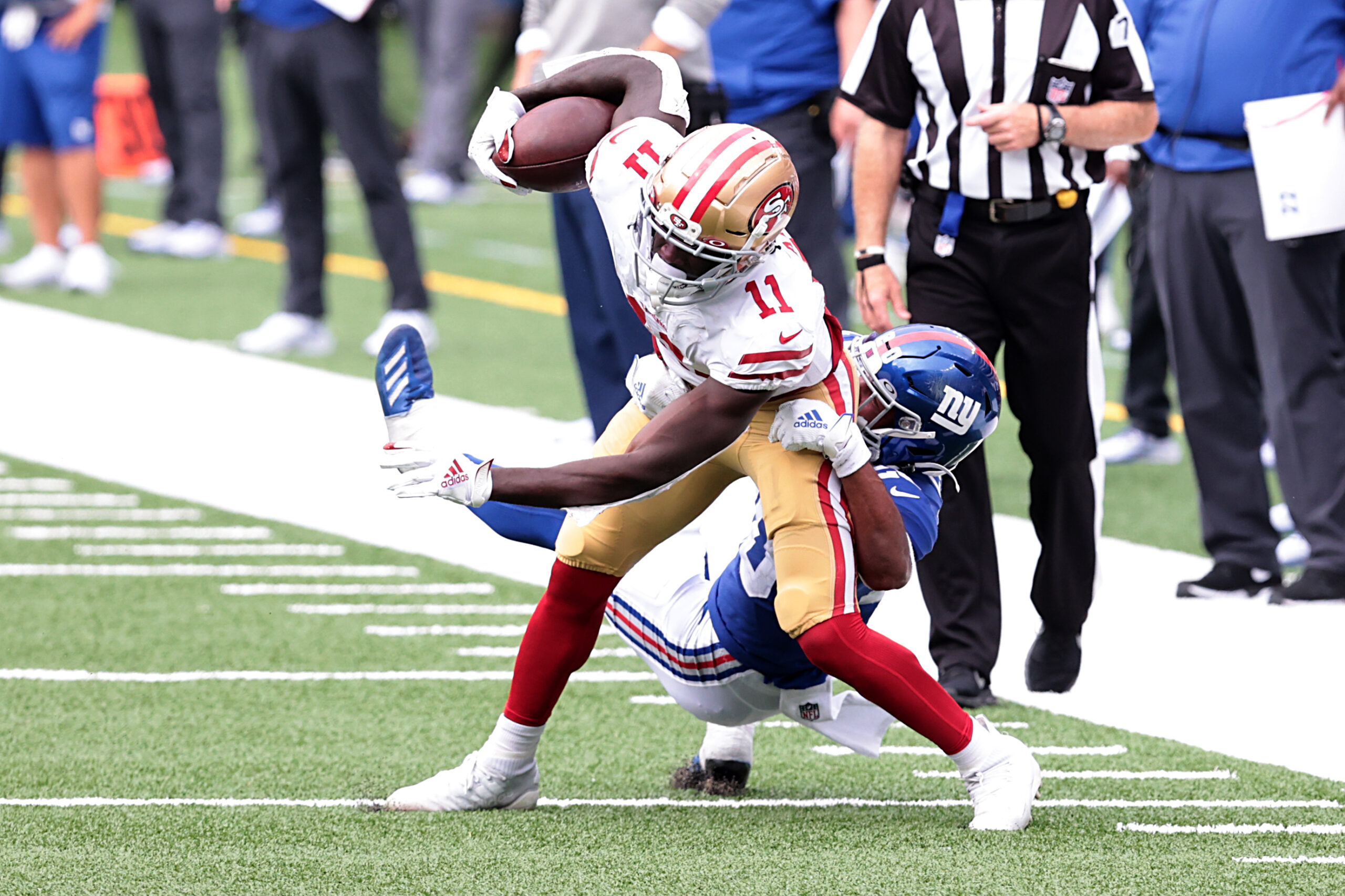 Sep 27, 2020; East Rutherford, New Jersey, USA; San Francisco 49ers wide receiver Brandon Aiyuk (11) fights for yards as New York Giants free safety Julian Love (20) tackles during the second half at MetLife Stadium. Mandatory Credit: Vincent Carchietta-Imagn Images
