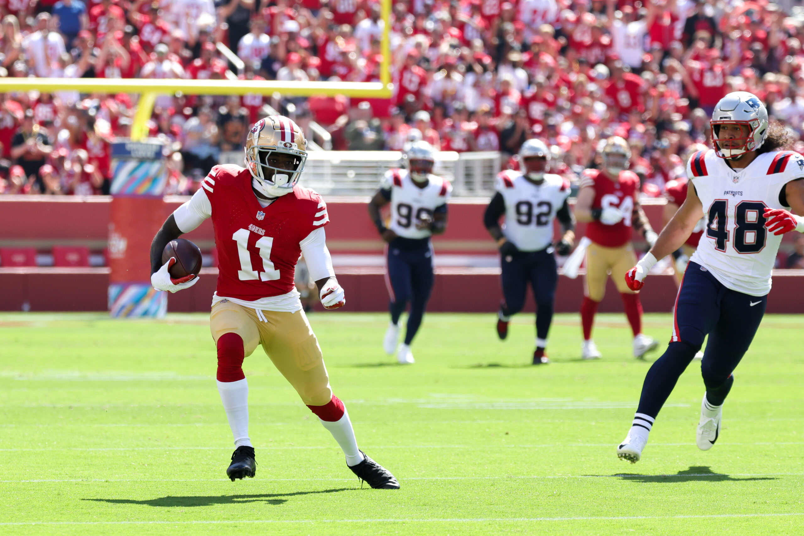 Sep 29, 2024; Santa Clara, California, USA; San Francisco 49ers wide receiver Brandon Aiyuk (11) runs with the ball past New England Patriots linebacker Jahlani Tavai (48) during the first quarter at Levi’s Stadium. Mandatory Credit: Sergio Estrada-Imagn Images