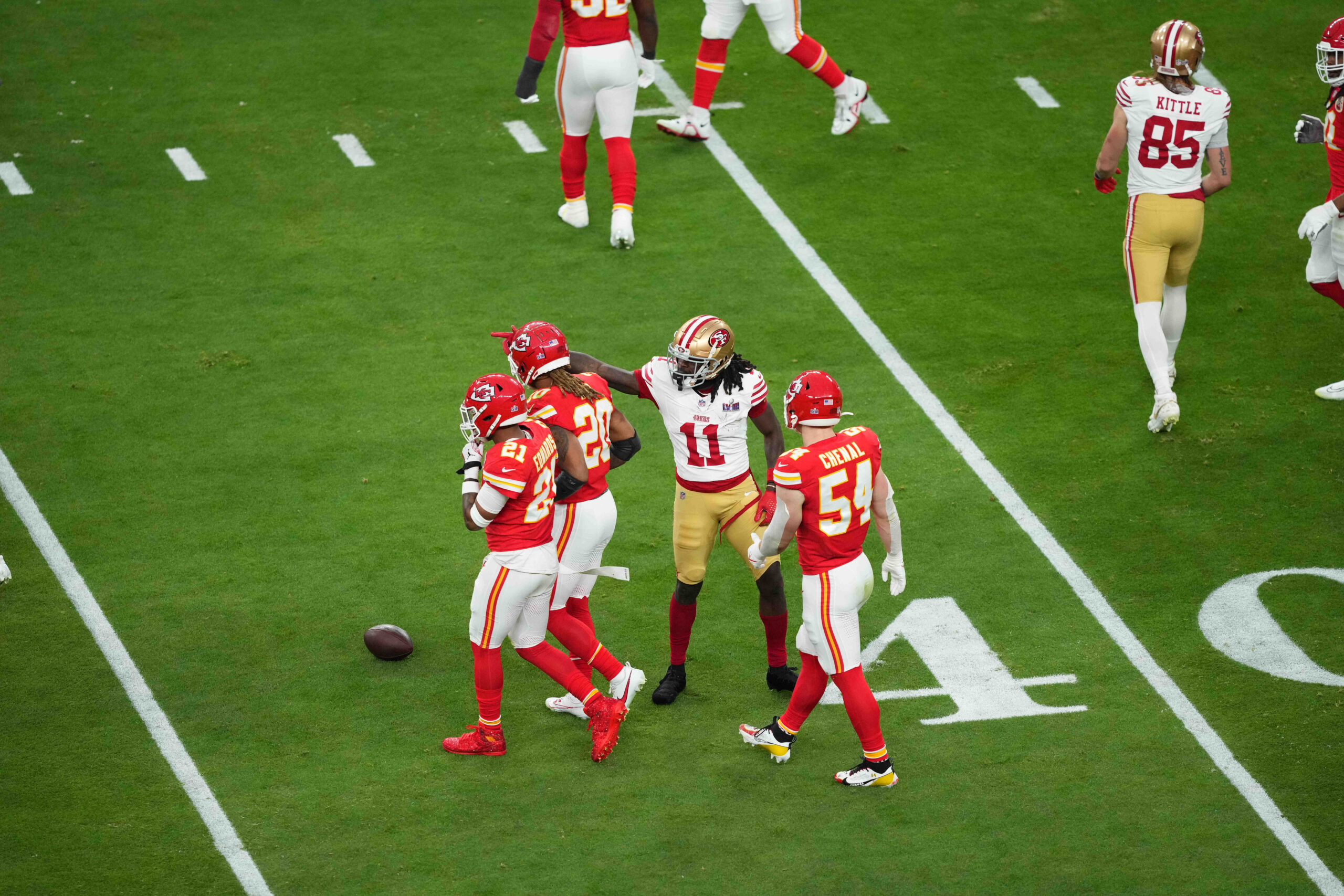 Feb 11, 2024; Paradise, Nevada, USA; San Francisco 49ers wide receiver Brandon Aiyuk (11) reacts after a play against the Kansas City Chiefs during the first quarter of Super Bowl LVIII at Allegiant Stadium. Mandatory Credit: Joe Camporeale-Imagn Images