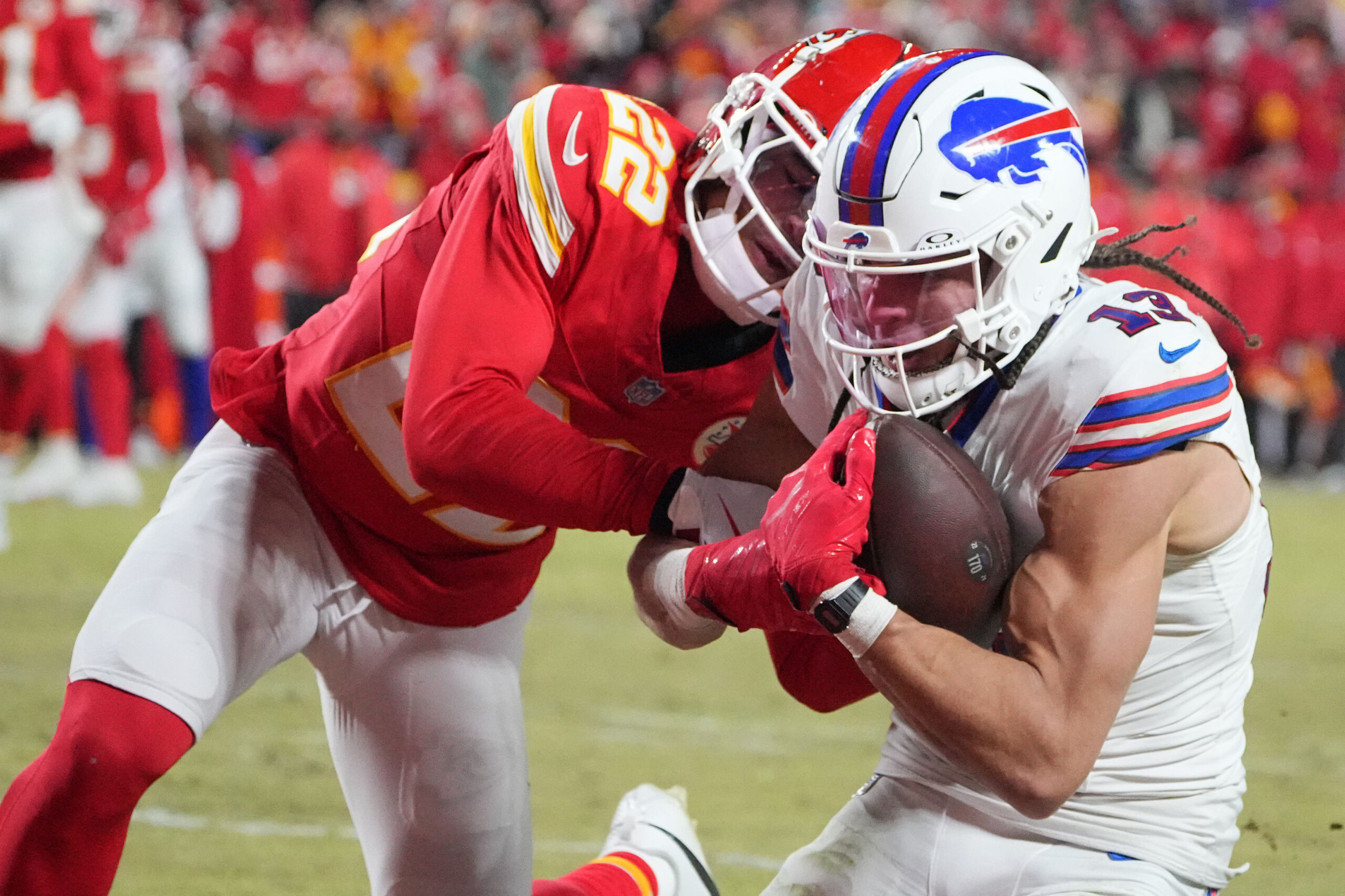Jan 26, 2025; Kansas City, MO, USA; Buffalo Bills wide receiver Mack Hollins (13) makes a catch for a touchdown against Kansas City Chiefs cornerback Trent McDuffie (22) during the first half in the AFC Championship game at GEHA Field at Arrowhead Stadium. Mandatory Credit: Denny Medley-Imagn Images