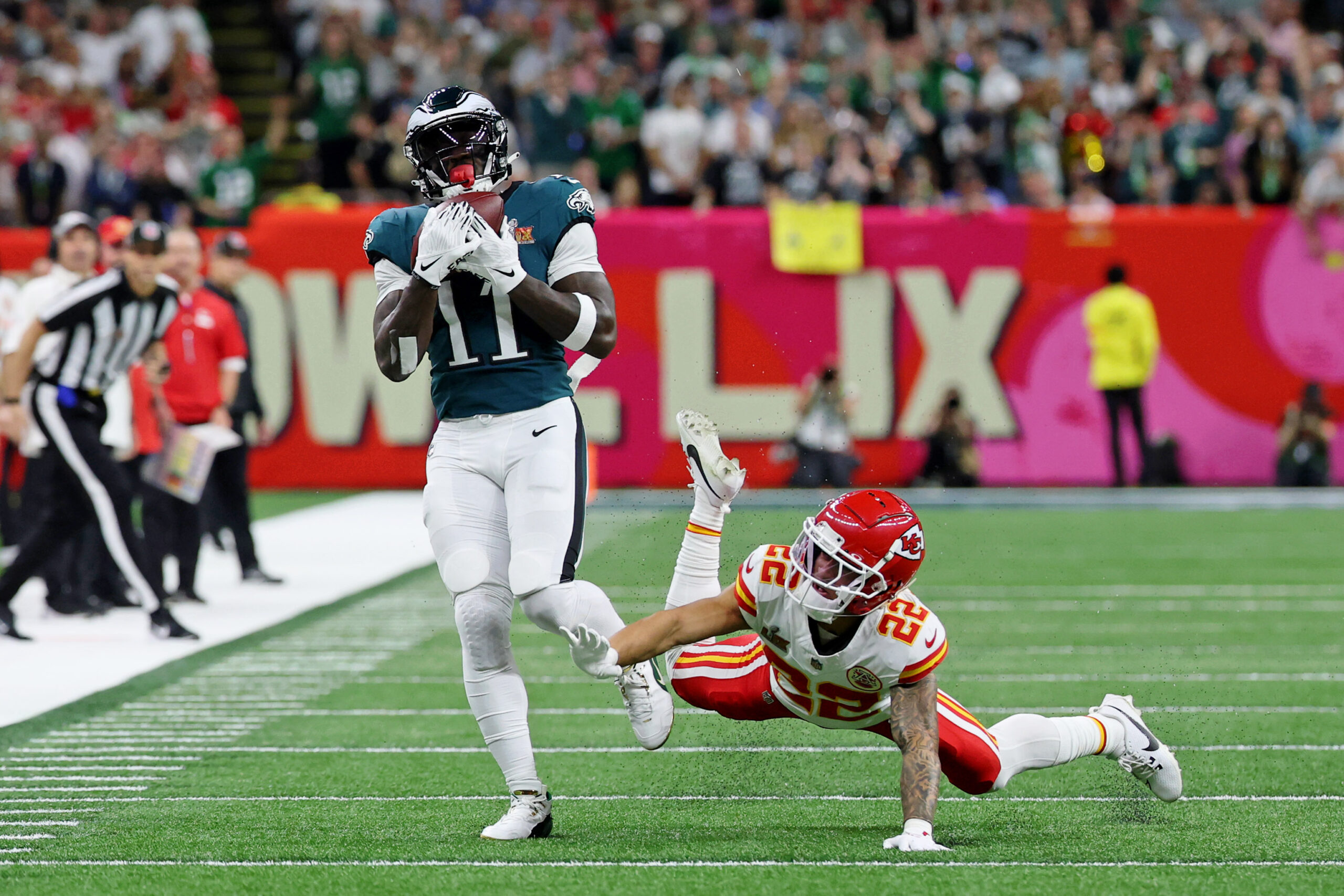Feb 9, 2025; New Orleans, LA, USA; Philadelphia Eagles wide receiver A.J. Brown (11) makes a catch against Kansas City Chiefs cornerback Trent McDuffie (22) during the first half of Super Bowl LIX at Caesars Superdome. Mandatory Credit: Geoff Burke-Imagn Images