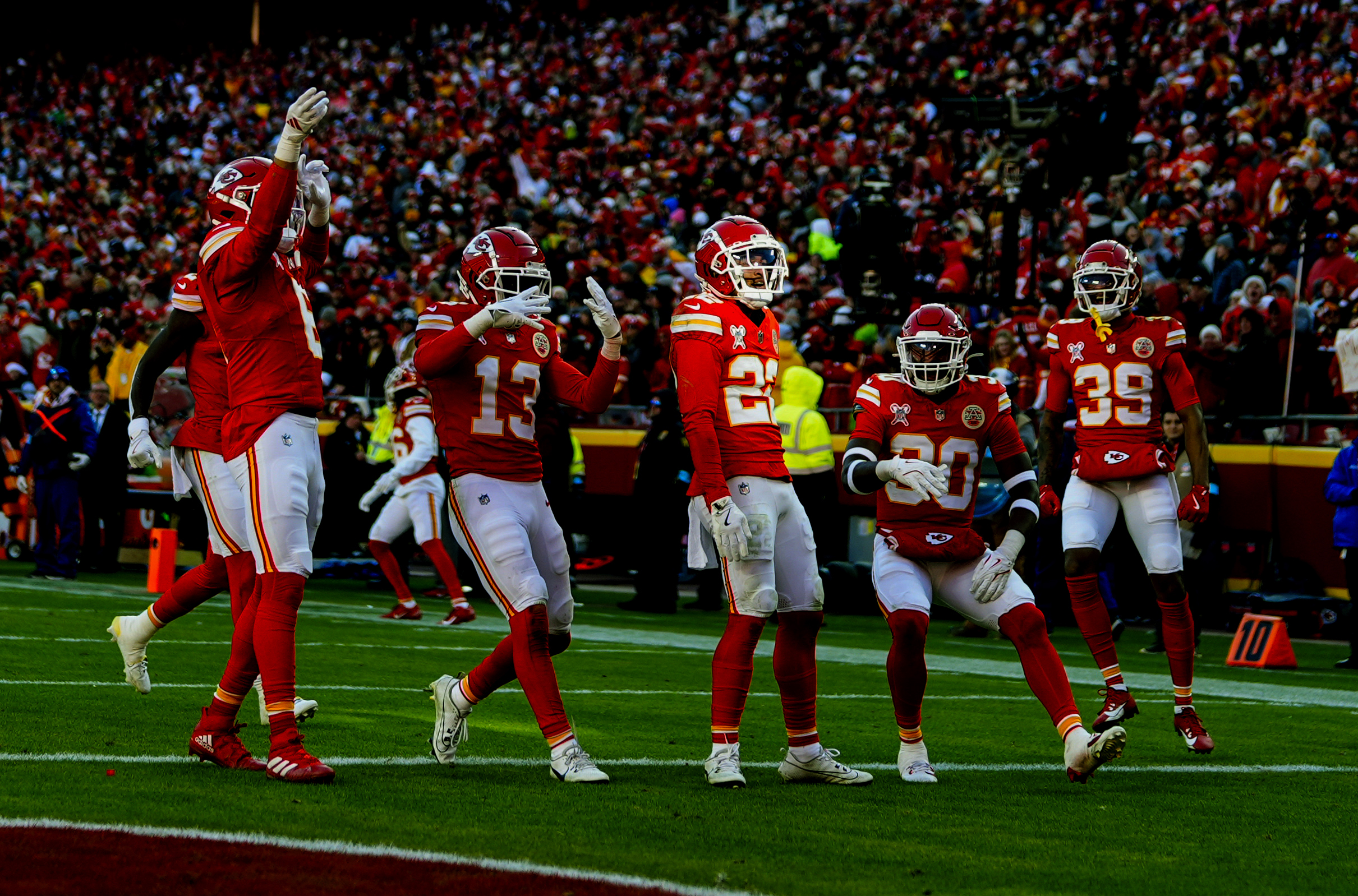 Dec 21, 2024; Kansas City, Missouri, USA; Kansas City Chiefs cornerback Trent McDuffie (22) celebrates with teammates after an interception during the first half against the Houston Texans at GEHA Field at Arrowhead Stadium. Mandatory Credit: Jay Biggerstaff-Imagn Images