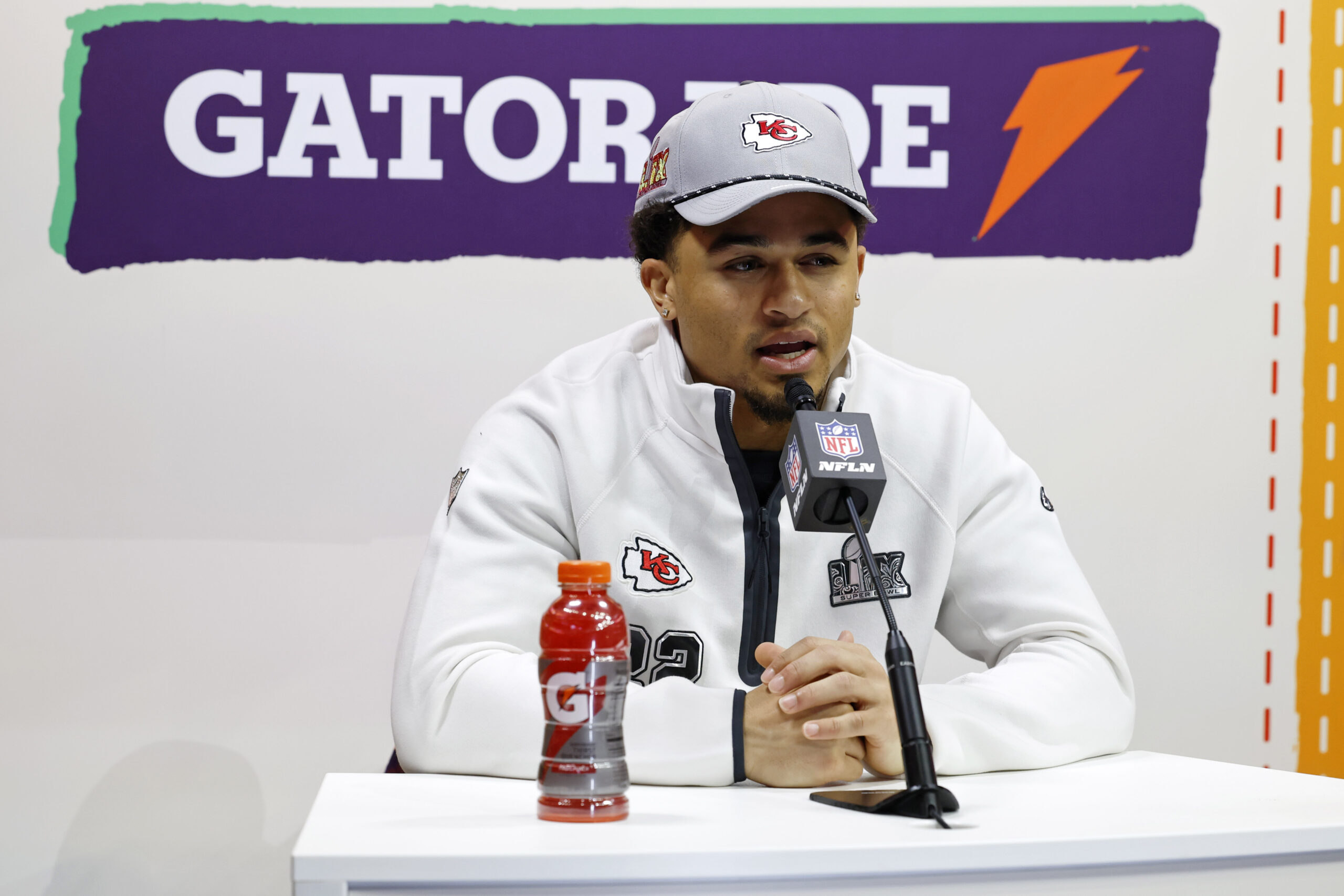 Feb 3, 2025; New Orleans, LA, USA; Kansas City Chiefs cornerback Trent McDuffie (22) talks to the media during Super Bowl LIX Opening Night at Ceasars Superdome. Mandatory Credit: Stephen Lew-Imagn Images