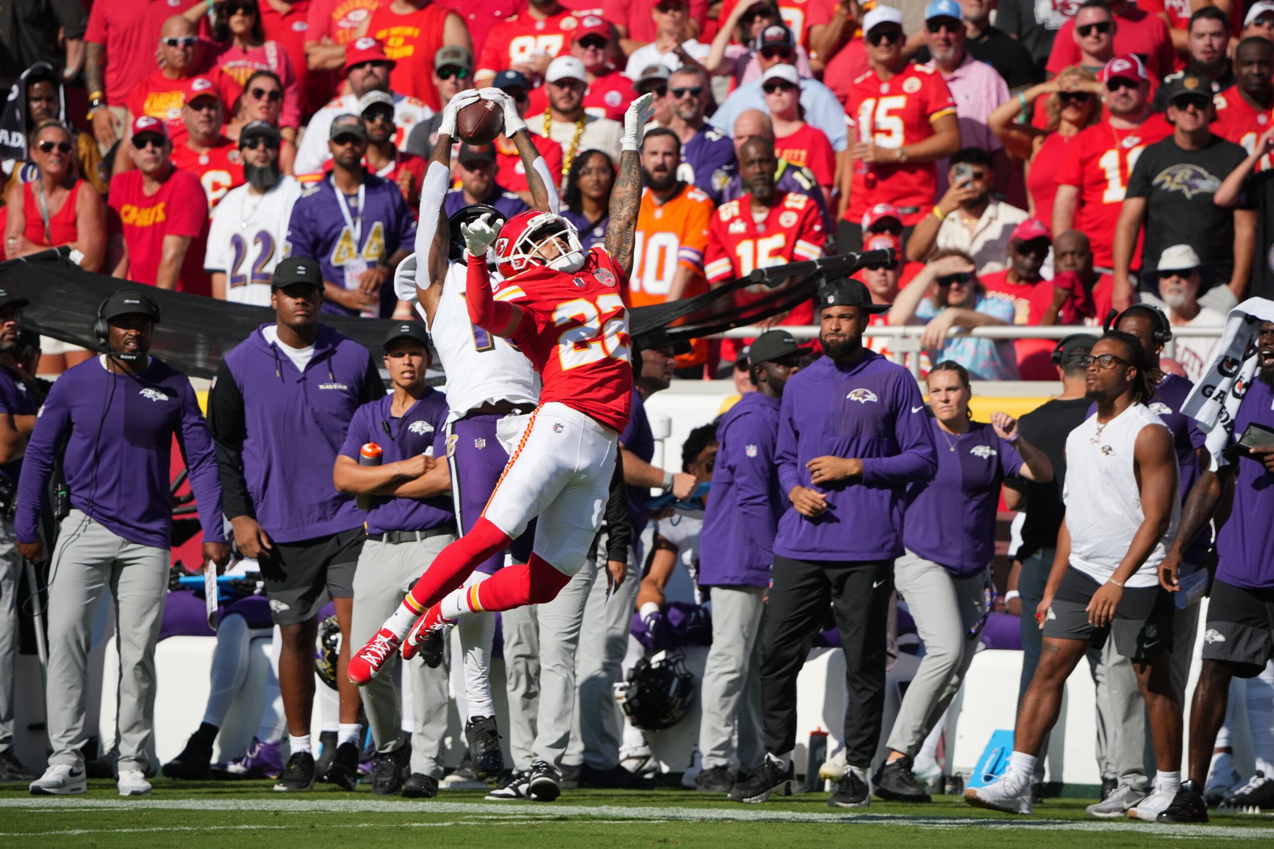 Sep 28, 2025; Kansas City, Missouri, USA; Baltimore Ravens wide receiver DeAndre Hopkins (10) makes a catch as Kansas City Chiefs cornerback Trent McDuffie (22) defends during the first quarter at GEHA Field at Arrowhead Stadium. Mandatory Credit: Denny Medley-Imagn Images