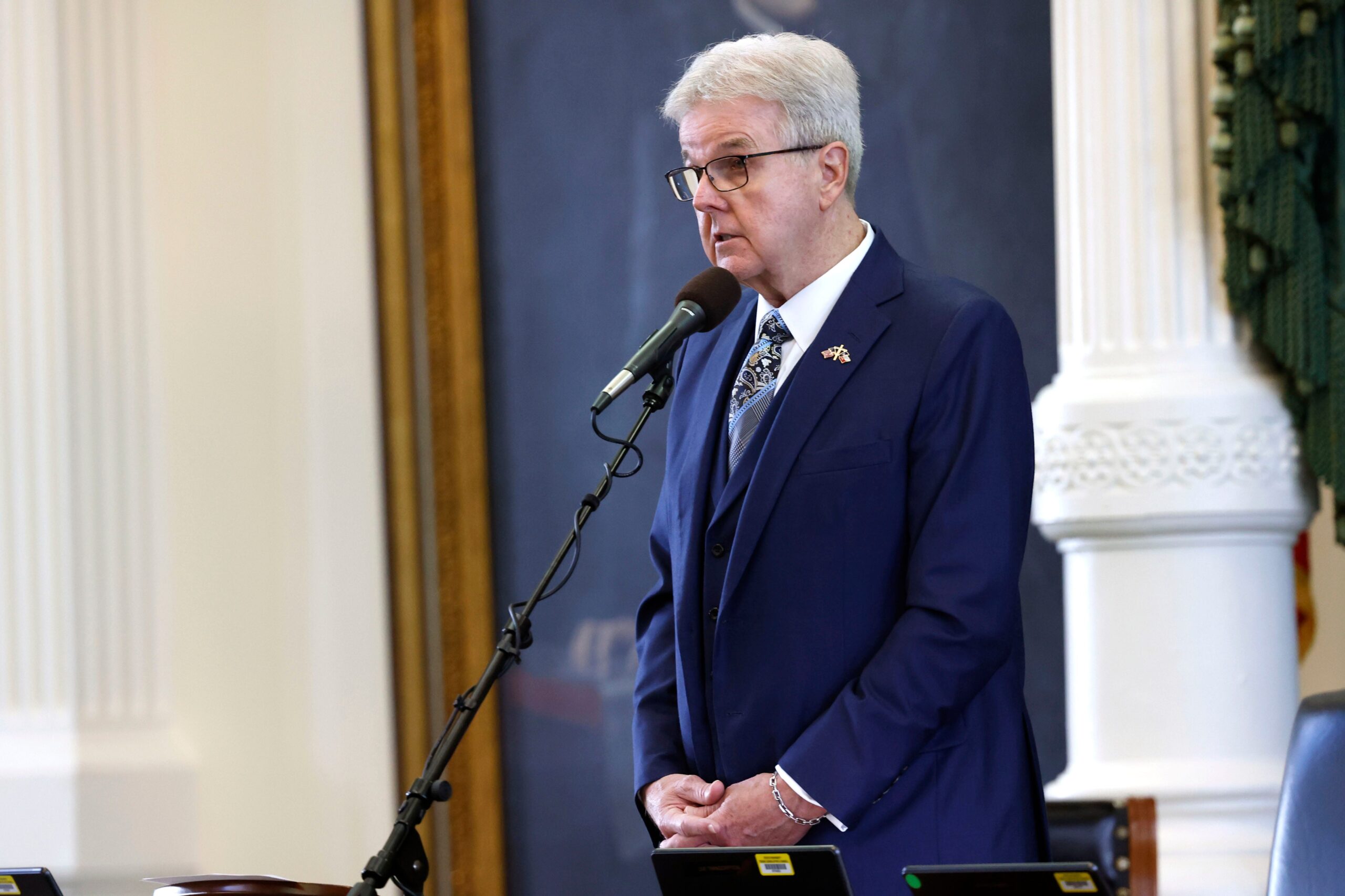 Sept. 5, 2023; Austin, TX, USA; Lt. Gov. Dan Patrick swears in senators during first day of Texas Attorney General Ken Paxton s impeachment trial in the Texas Senate chambers at the Texas State Capitol in Austin on Tuesday, Sept. 5, 2023. The Texas House, including a majority of its GOP members, voted to impeach Paxton for alleged corruption in May. Mandatory Credit: Juan Figueroa/Pool via USA TODAY NETWORK